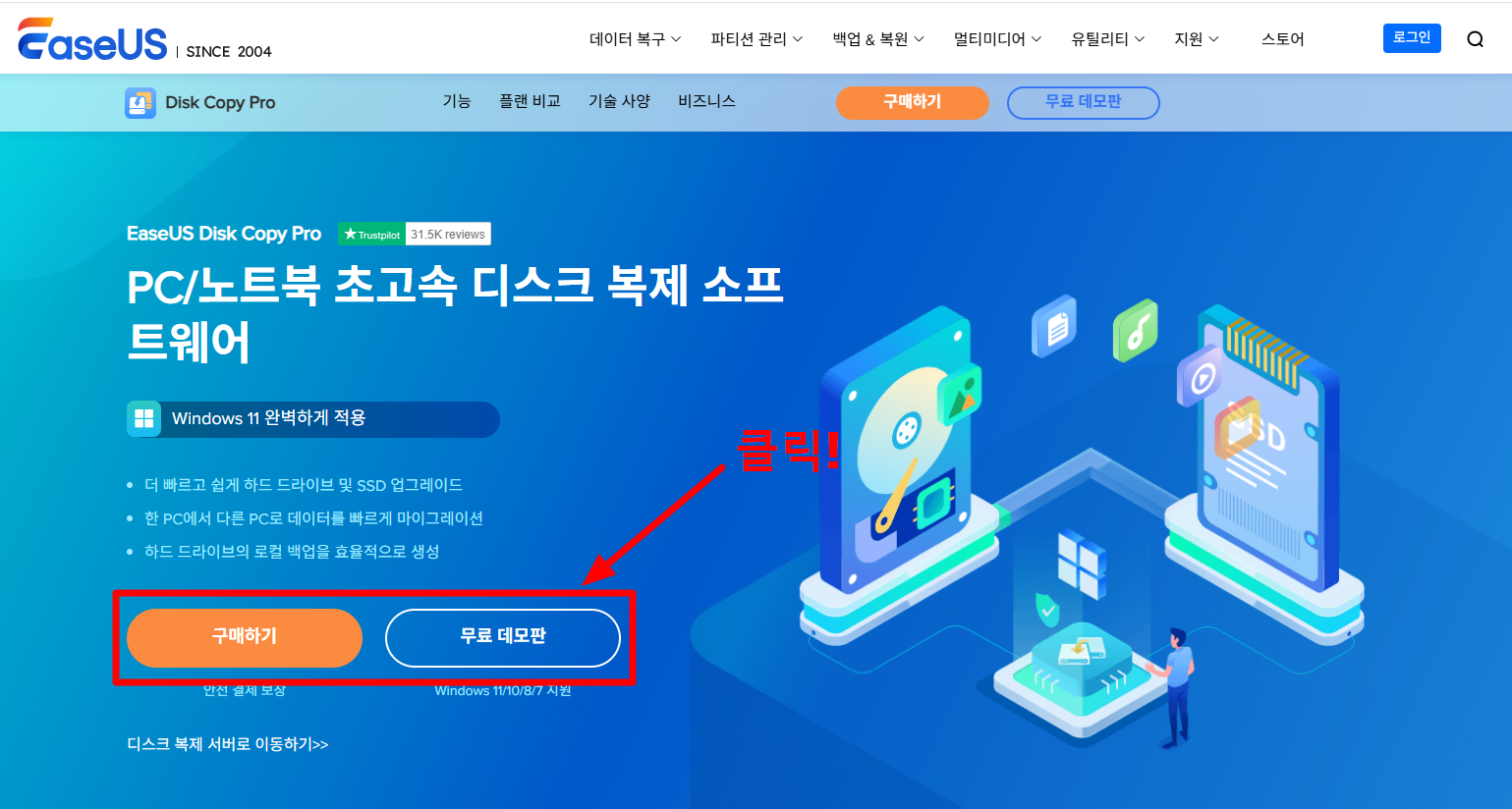 아래 링크된 다운로드 페이지에 접속하여 "구매하기" 또는 "무료 데모판" 버튼을 클릭한 후, 다운로드를 진행해 프로그램을 설치합니다. 디스크 복제를 위해서는 유료 결제가 필요하지만, 먼저 무료 데모판을 설치해 프로그램을 체험해 본 후 결제 여부를 결정하는 것이 더 좋을듯 하네요.