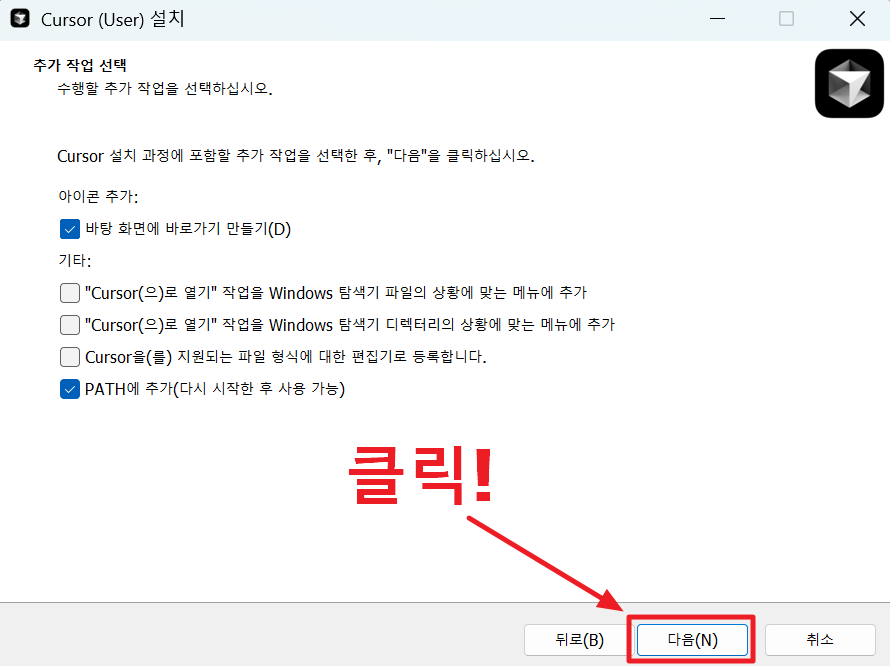 4. 그러면 시작 메뉴 폴더 선택창 여부를 물어보는데요. 시작 메뉴에 생성하면 컴퓨터를 켤 때마다 Cursor가 자동 실행되므로, 저는 ‘시작 메뉴 폴더를 만들지 않음’ 체크박스를 선택한 뒤 다음 버튼을 누르겠습니다.