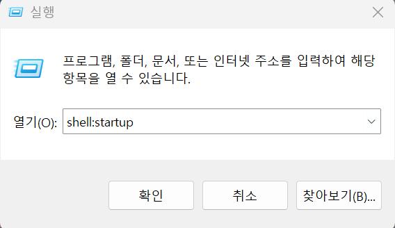 윈도우 실행창에서 위의 명령어를 입력하시면 시작 프로그램 폴더로 즉시 이동합니다.