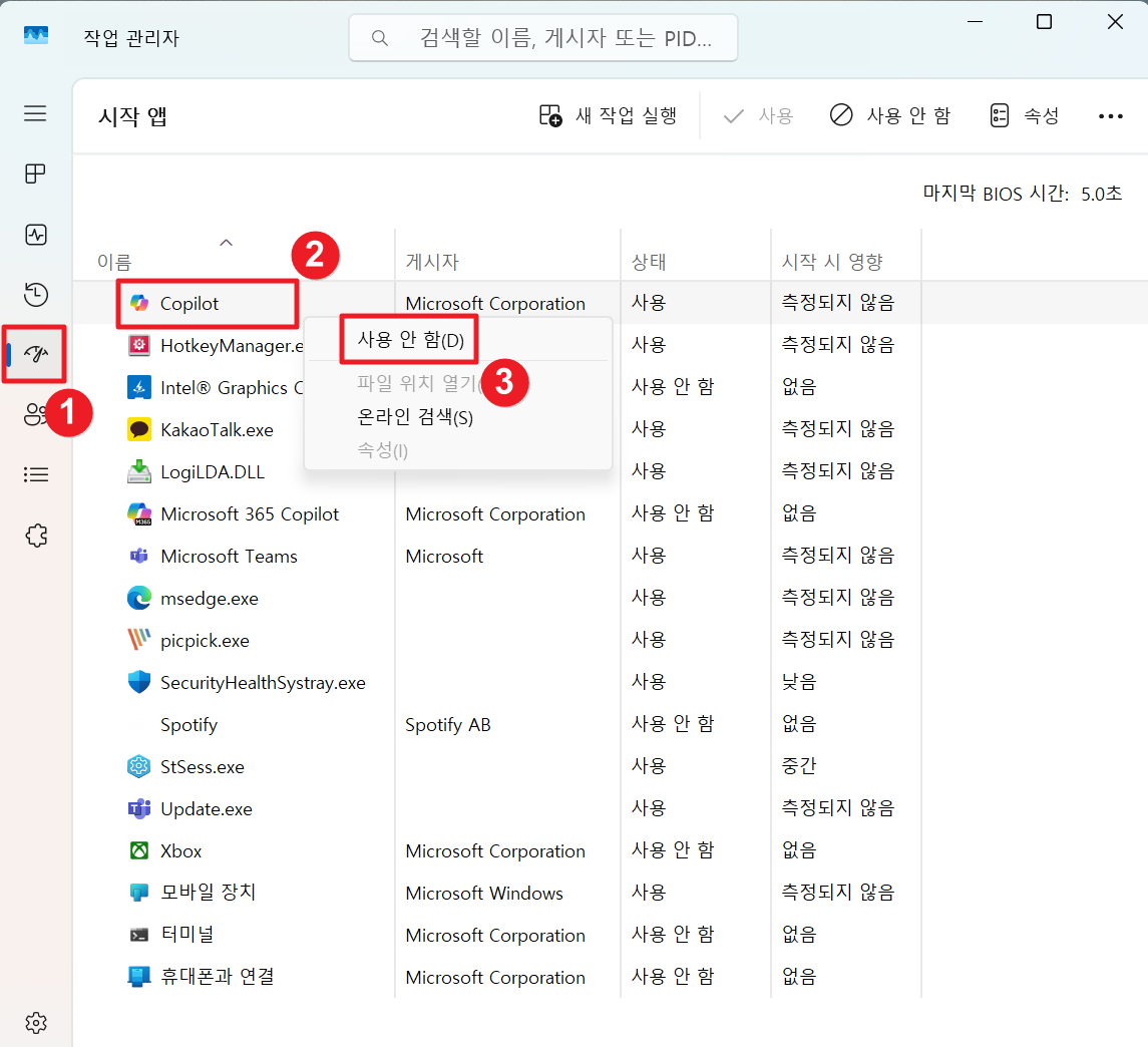 Ctrl + Shift + Del 키를 눌러 작업관리자로 들어간 뒤, 좌측탭에서 시작앱을 클릭 후, 프로그램을 우클릭하고 사용 안함으로 체크해주시면 되겠습니다.