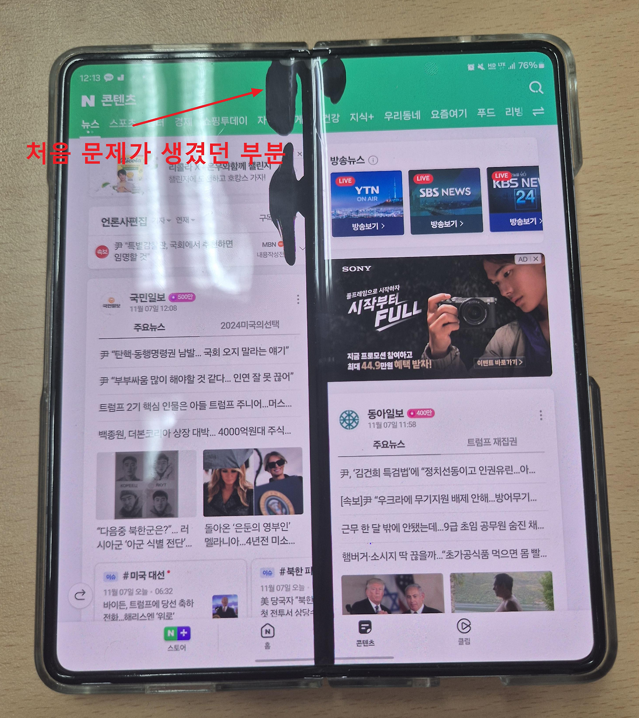 갤럭시 폴드는 일반 바형 핸드폰보다 약하기 때문에 무조건 필름 보호를 꼭! 꼭! 해주셔야 합니다. 저는 심지어 보호필름을 장착했는데도 몇 년 사용하니까 가운데 접히는 부분의 디스플레이가 손상된 적이 있습니다. 저렇게 되니까 터치도 안 돼서 그냥 내부 디스플레이를 쓰지를 못하더라고요.