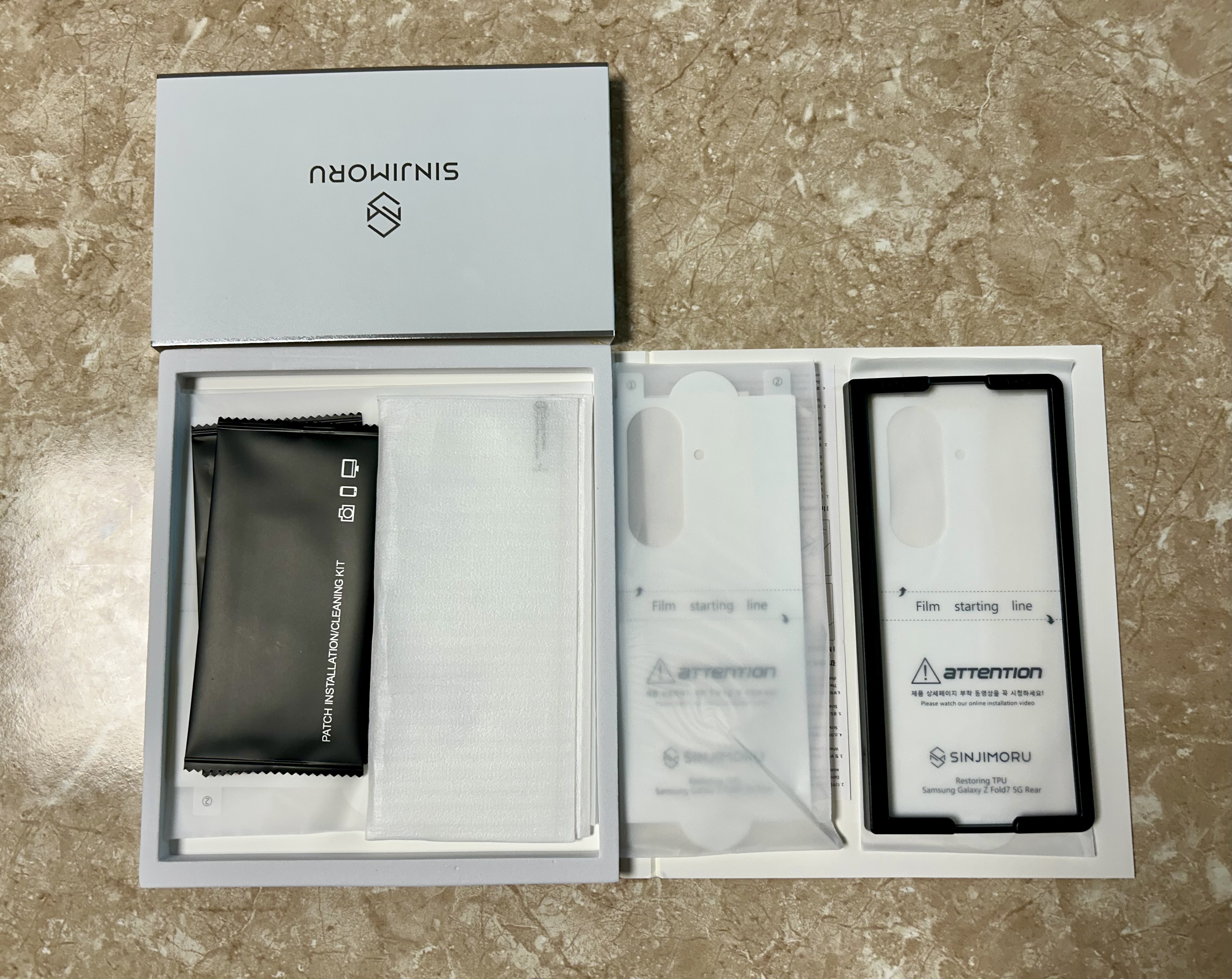 폴드7은 기본적으로 전면과 내부에 보호 필름이 한 겹 붙어 나오지만, 이 한 겹으로는 내구도가 약해요. 그래서 저는 추가로 전용 보호 필름을 구매해서 붙였습니다. 갤럭시 폴드7 전용 필름답게 접히는 부분도 자연스럽게 잘 맞았고 터치감도 크게 달라지지 않았습니다. 특히 내부 화면은 광활하다 보니 작은 스크래치에도 티가 확 나는데, 필름 덕분에 안심이 됐어요. 제가 구매했던 필름의 이름은 신지모루 갤럭시 z폴드7 전용 보호필름이에요.