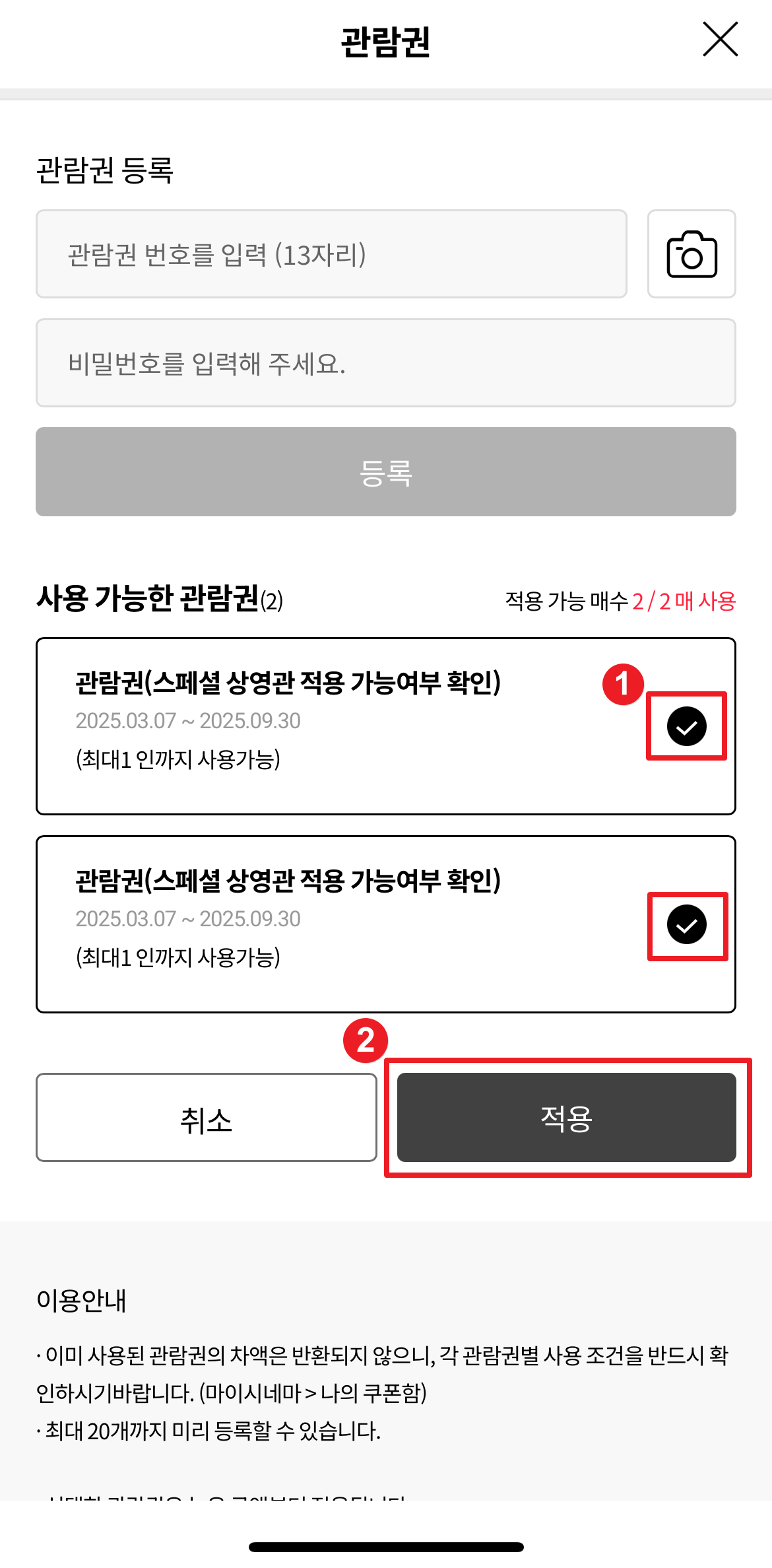 2. 그런 뒤 사용 할 관람권을 적용해 주세요.