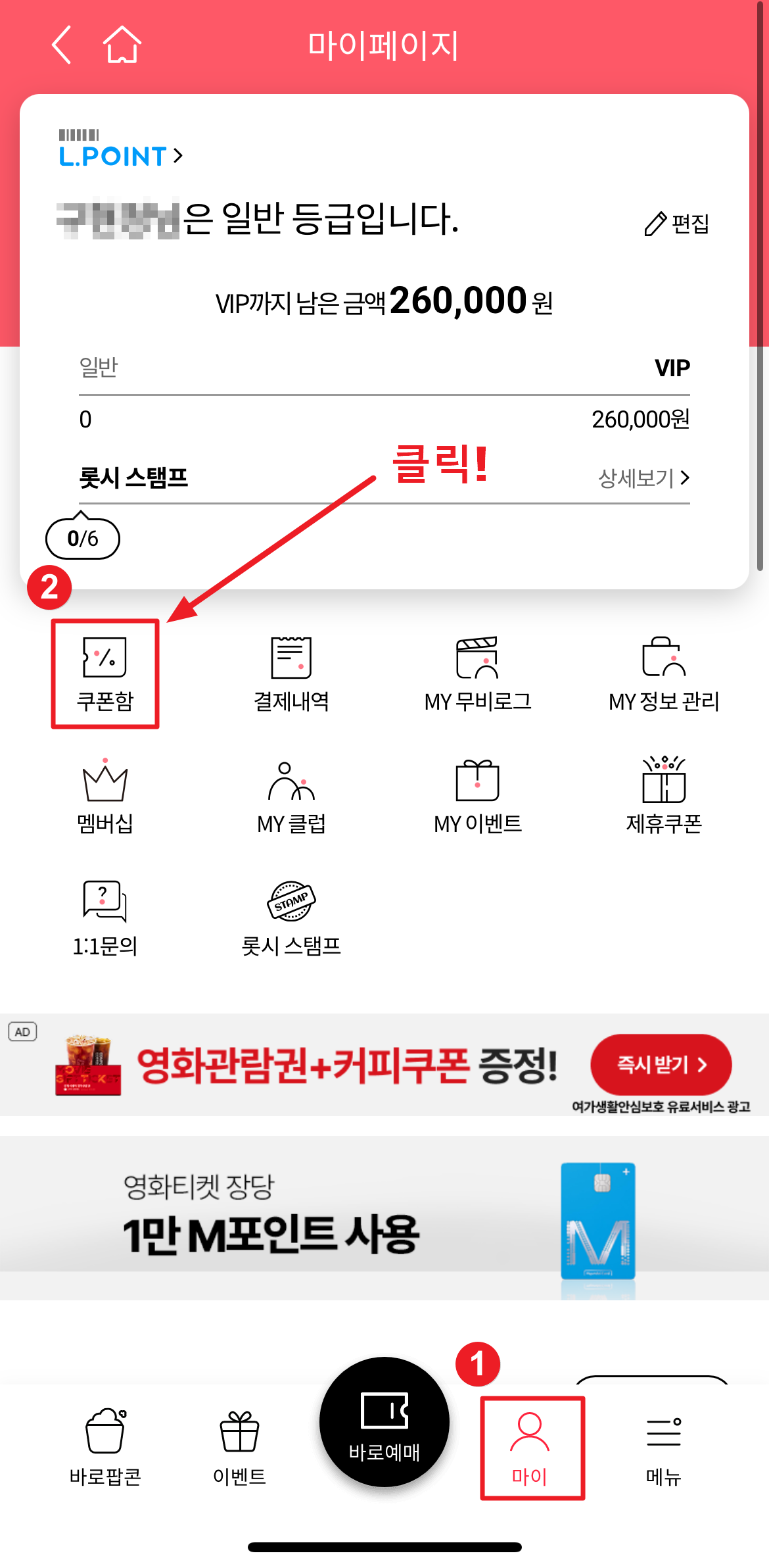 1. 롯데시네마 앱을 실행한 뒤(앱이 없으시다면 플레이스토어에서 다운로드하세요), 하단 메뉴에서 "마이" 버튼을 눌러 마이페이지로 이동합니다. 그다음 "쿠폰함"을 선택해 쿠폰 내역을 확인하세요.