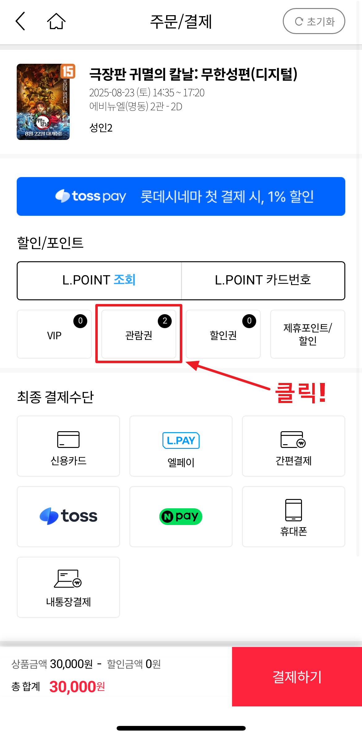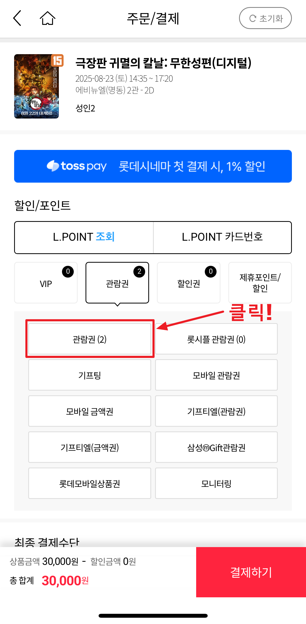 1. 자신이 보고싶은 영화와 좌석을 선택한 뒤, 결제를 하려고 하면 위와 같이 "관람권"이라는 버튼이 있을 겁니다. 이걸 클릭해 주세요.