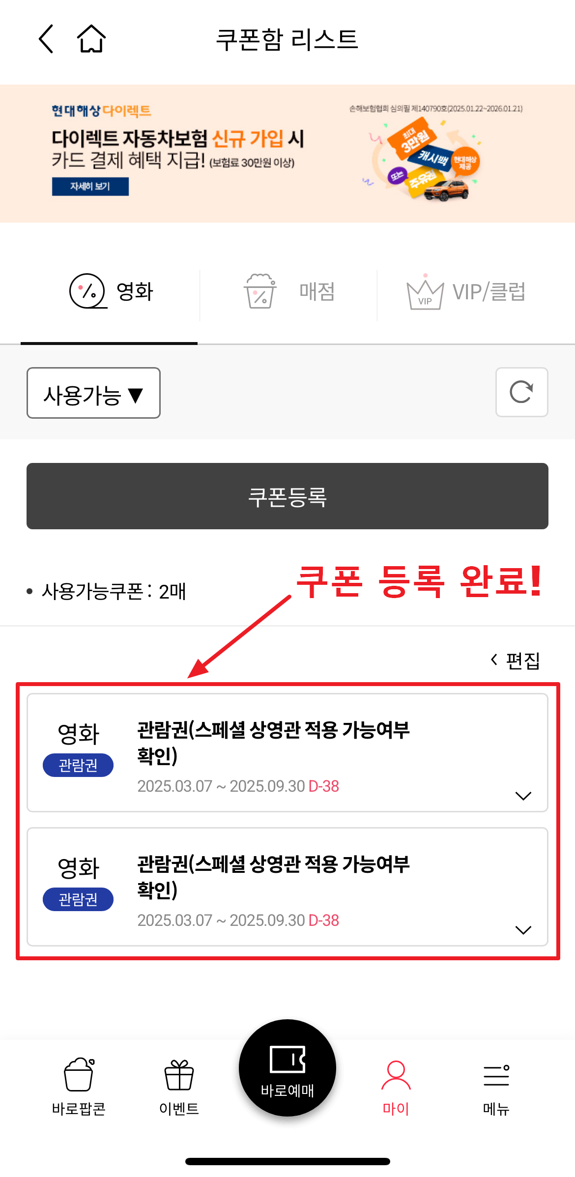 2. 헌혈 기념품 - 영화 관람권 쿠폰 사용하기