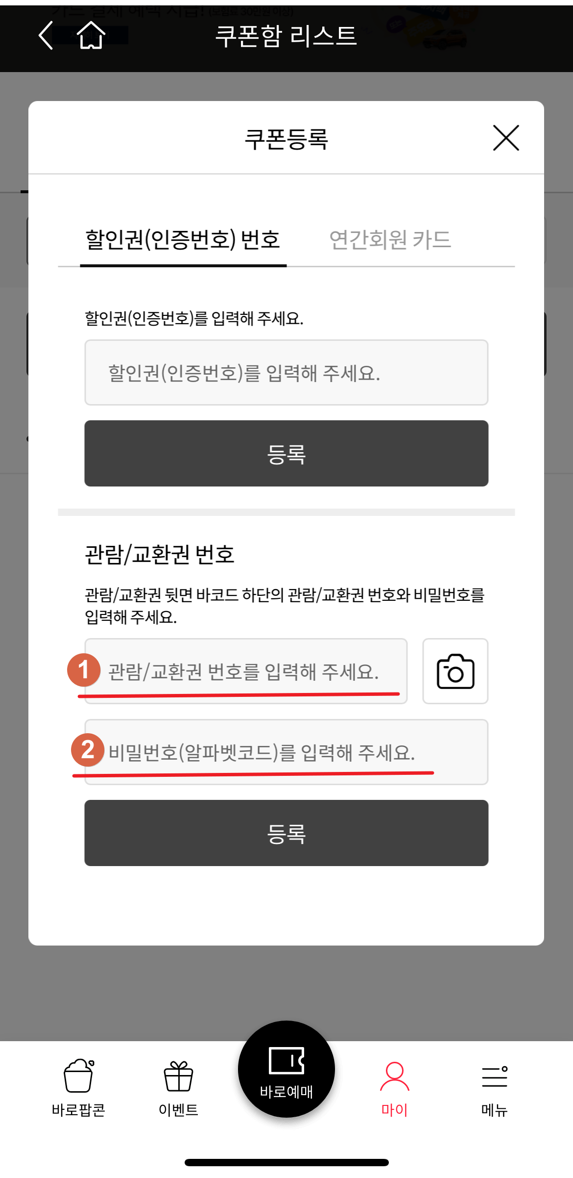 3. 그럼 관람/교환권 번호를 입력하는 칸이 나오는데요. 저희가 필요한건 교환권 번호와 비밀번호(알파벳코드)에요. 이 두 가지 코드는 헌혈을 하고 받은 영화관람권 뒷면에 적혀 있습니다.