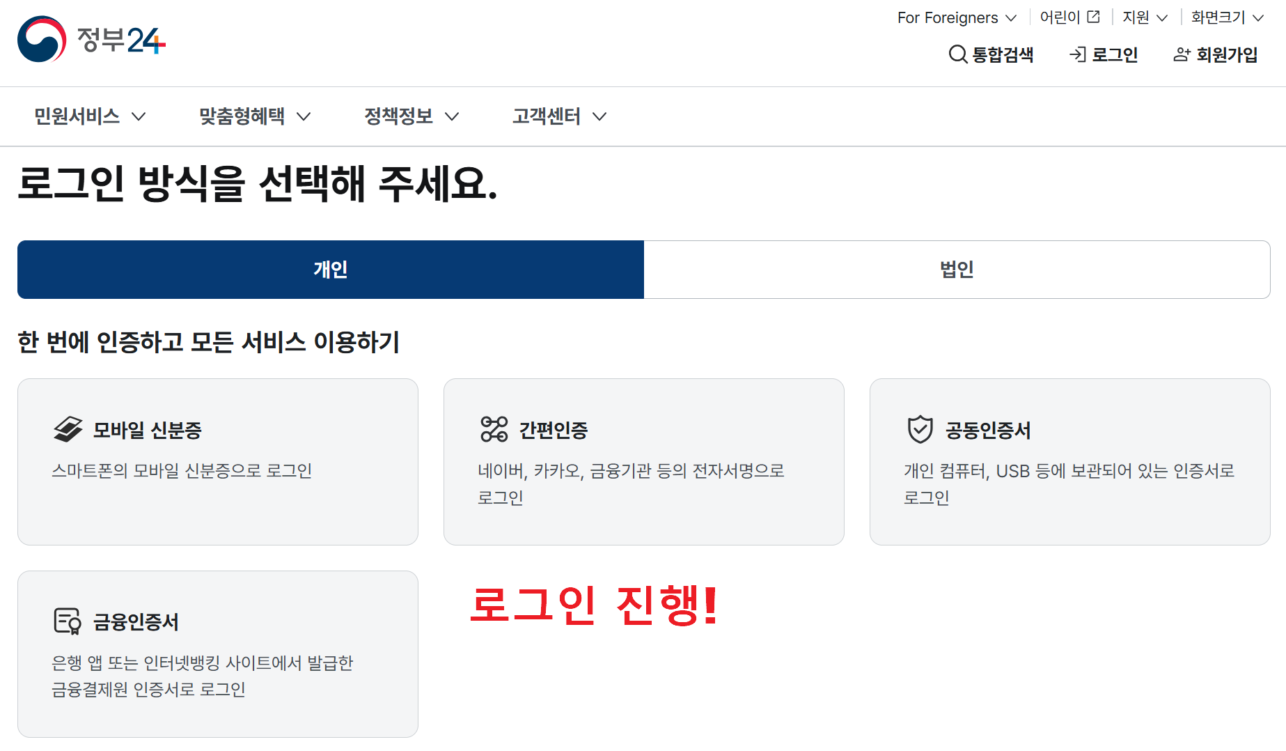 3. 전입신고를 하려면 먼저 정부24에 로그인해야 합니다. 로그인을 해야만 전입신고 절차가 진행되니 반드시 먼저 해주세요. 저는 여러 방법 중에서 간편인증(휴대폰 본인인증, 공동/금융인증서 연동 등)을 이용하는 게 가장 편리하더라고요.