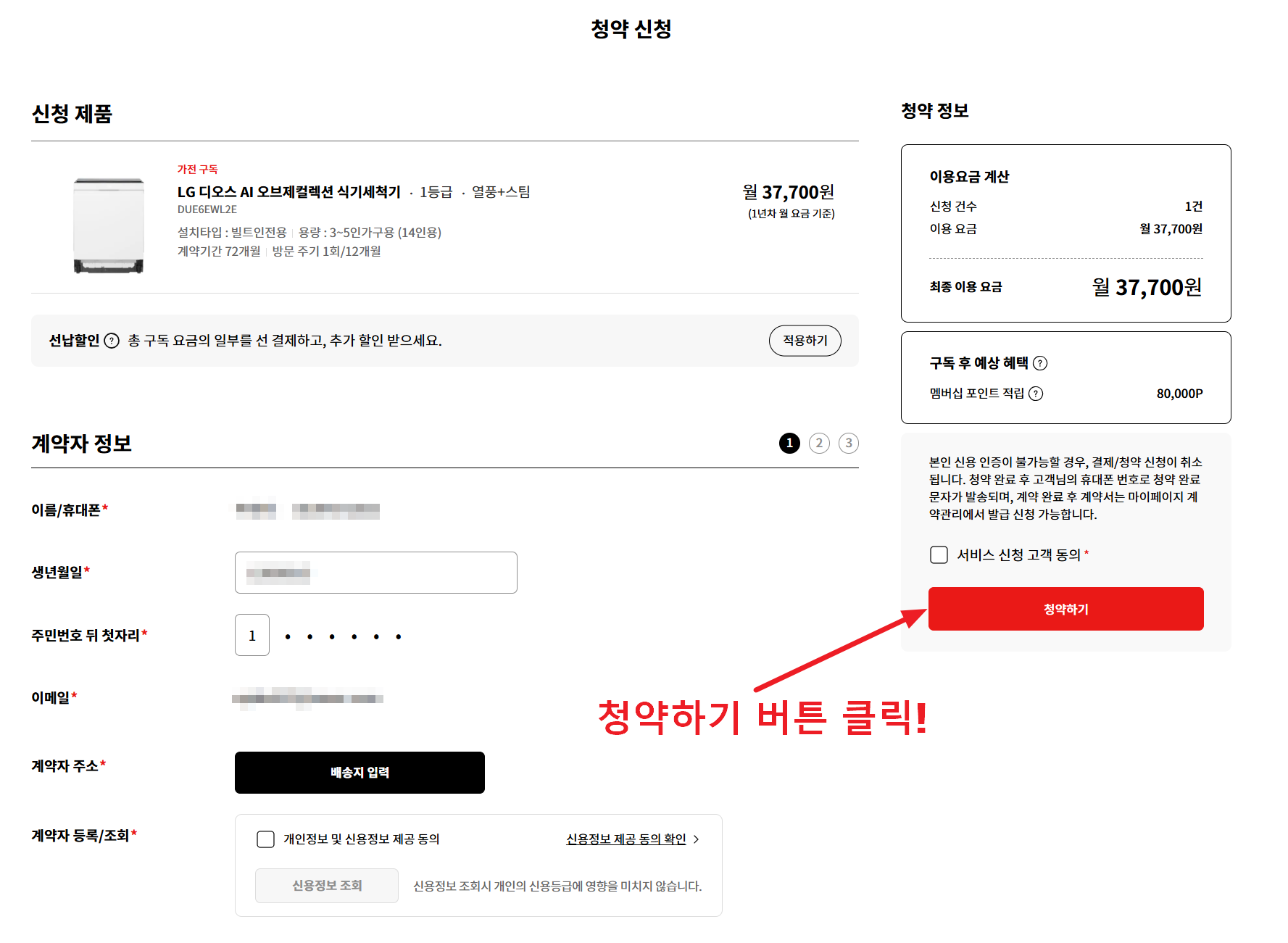 5. 마지막으로 계약자 정보와 배송지를 확인 후 “청약하기” 버튼을 누르시면 구독이 완료됩니다.