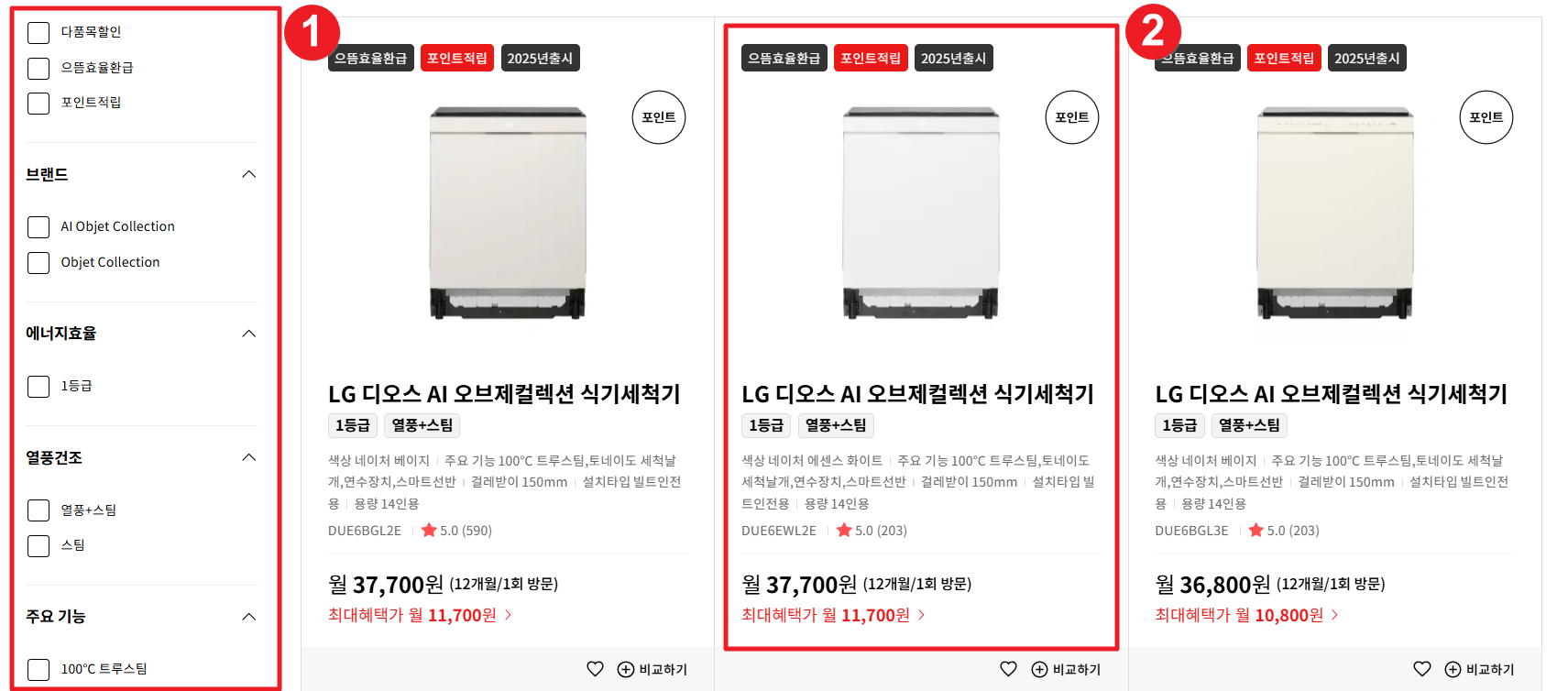 1. 아래 링크된 LG전자 공식사이트에 들어가셔서 상단의 가전 구독 메뉴를 선택 후, 가전 카테고리를 선택하고, 자신이 구독하고 싶은 가전 기기를 선택합니다. 저는 “주방가전” 카테고리의 “식기세척기”를 한번 선택해볼게요.