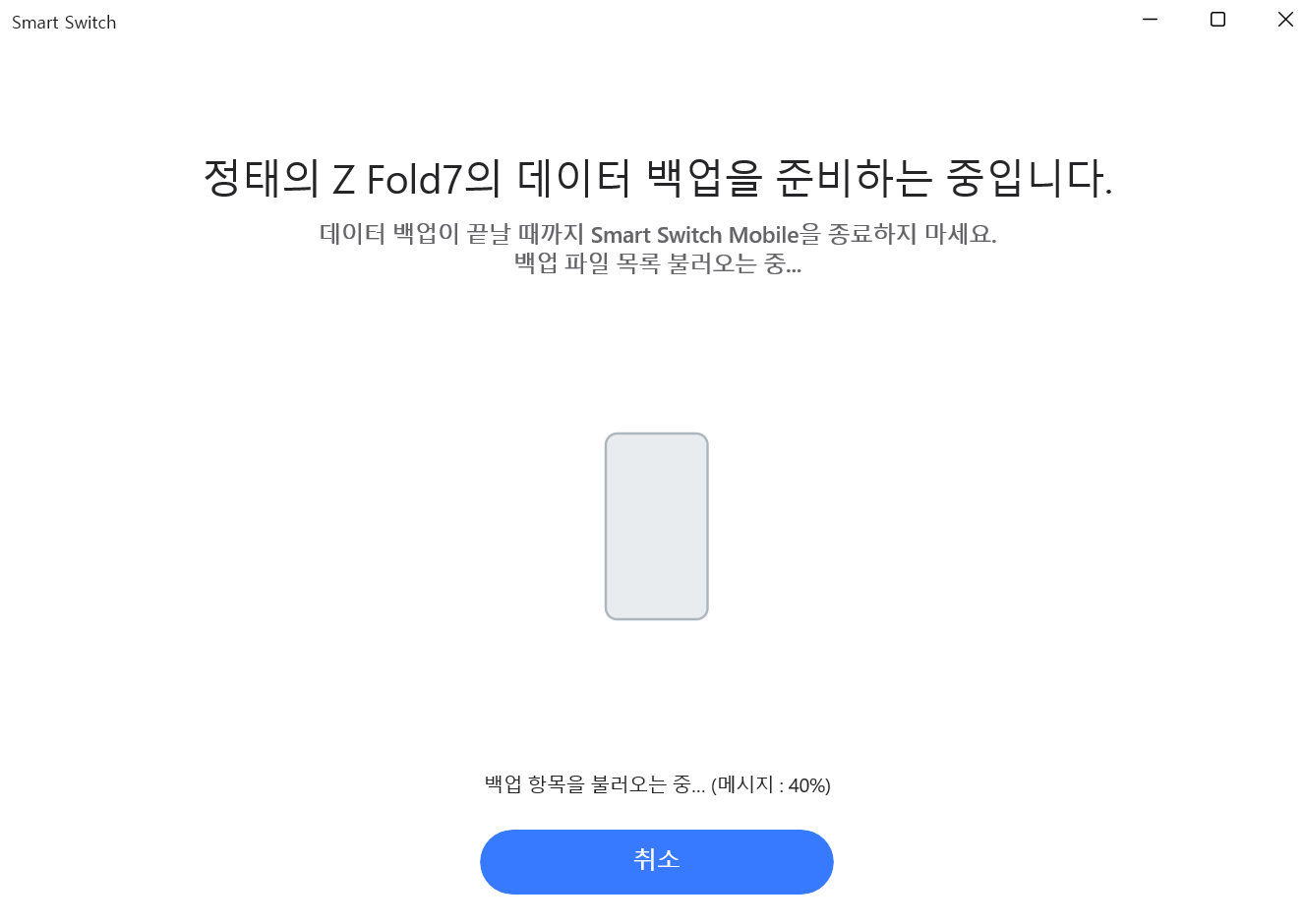 이제 갤럭시 스마트폰을 USB 케이블로 PC에 연결합니다. 그러면 삼성핸드폰을 연결해주시면 Samsung Smart Switch가 연결을 진행할거에요. 연결 후 스마트폰 화면에“데이터 접근 허용” 또는 “USB 사용 목적”이 뜨면허용 / 확인을 눌러주세요.참고로 충전 전용 케이블을 사용하면 PC에서 기기가 인식되지 않을 수 있으니 데이터 전송 가능한 USB 케이블인지 꼭 확인하세요.