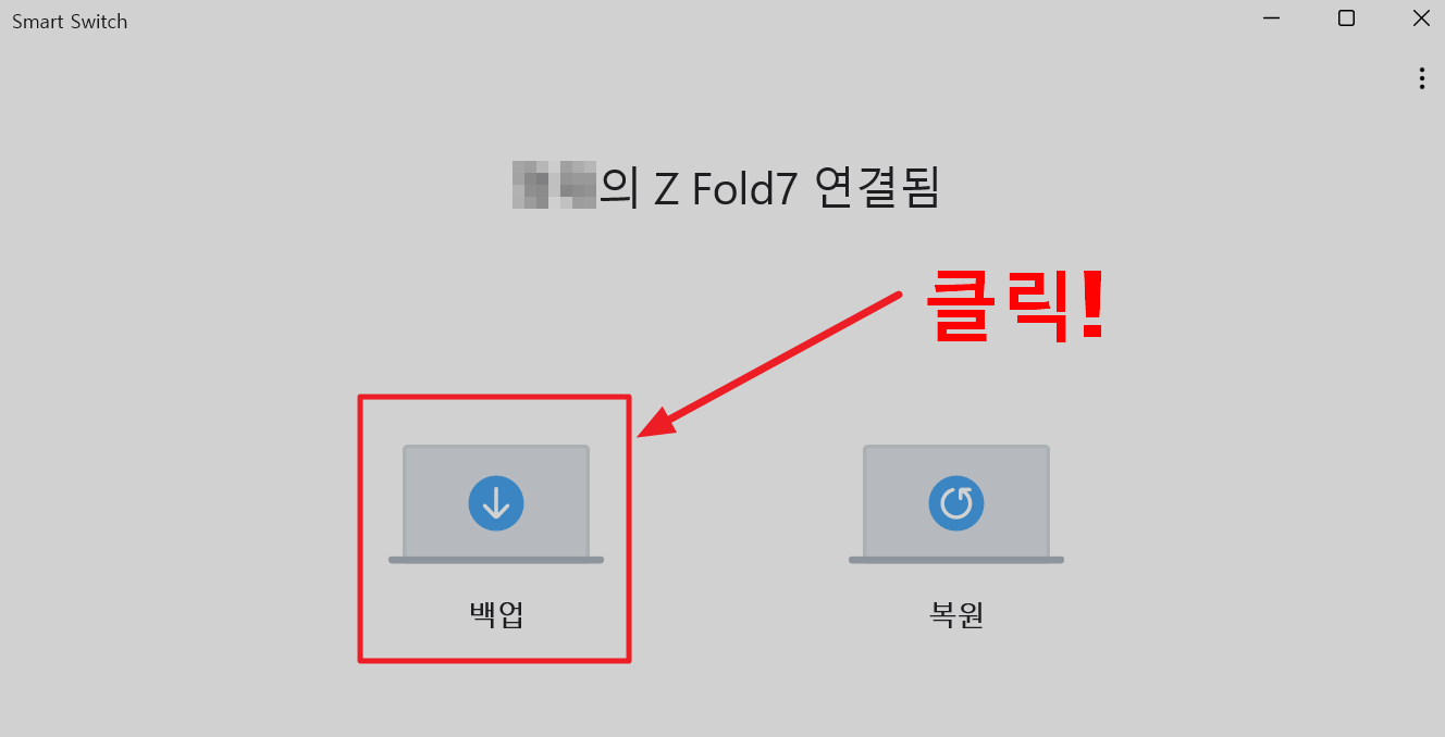 그리고 PC Smart Switch에서 백업 버튼을 클릭합니다. 만약에 기존에 백업해둔 데이터를 이용해 복원하시기를 원하신다면 우측에 복원 버튼을 누르시면 되겠죠?