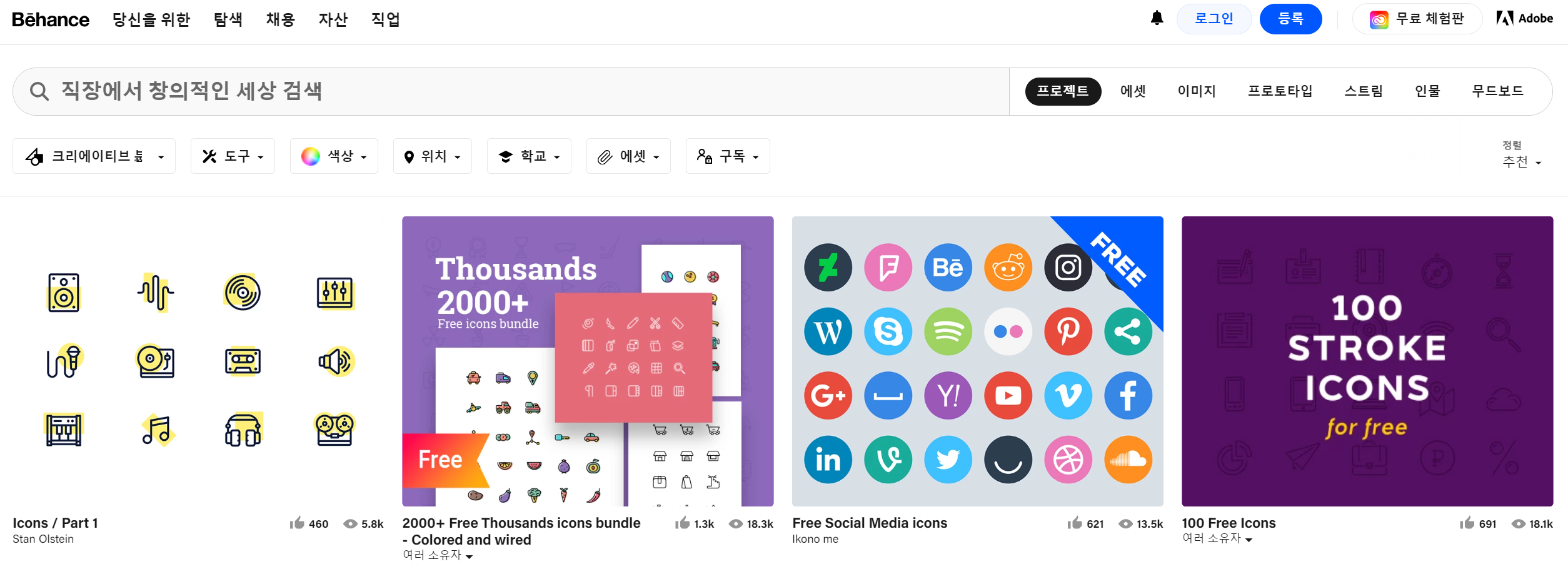월 정액방식을 사용하고 있는 iconfinder입니다. 무료는 아니지만 혹시나 필요하신 분이 계실까 싶어 가져와봤습니다. thenounproject와 같이 컬러별 다운로드를 지원하고 다양한 파일형태의 저장을 지원하는 등 기능면에 있어서는 굉장히 강력합니다.