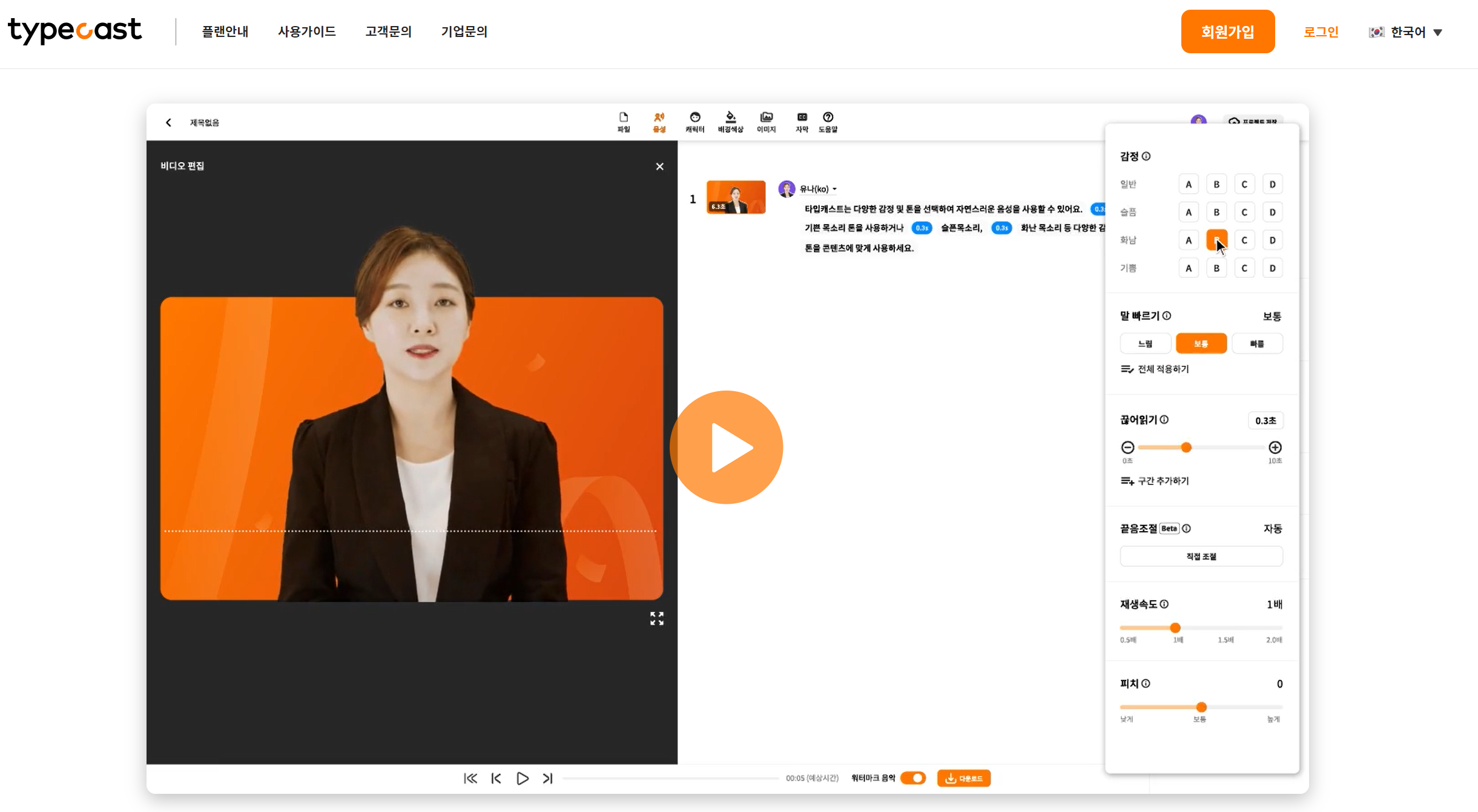 개인적으로 가장 추천드리는 사이트로 AI의 느낌이 가장 적게 나는 음성을 만들 수 있습니다. 말에 감정도 넣을 수 있고 말 빠르기도 적절히 조절할 수 있습니다. 특히 말을 중간에 쉬었다가 이어서 할 수 있는 쉼 추가라는 기능이 있어 말투를 최대한 자연스럽게 만들 수 있습니다. 한국에서 개발한 사이트로 보이는데 기술력이 놀랍습니다.