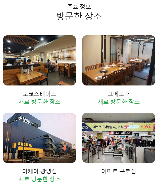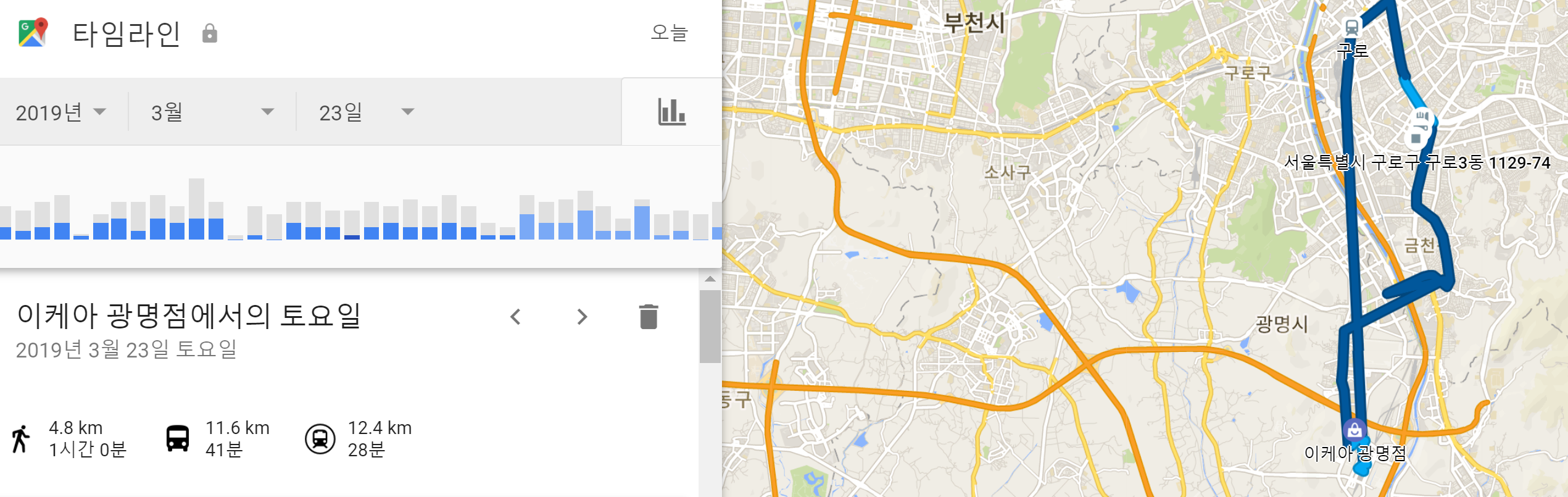 위 사진은 Google Maps Timeline서비스를 기반으로 제가 이때까지 다녀왔던 장소를 표시한 것입니다. 제가 모르는 사이에 이런 것이 기록되어 있었다니 놀랍습니다. 저는 부산이 고향이고 서울이 현재 살고 있는 공간입니다. 그렇기에 부산과 서울에 유독 많은 점들이 찍혀있네요. 여기에 있는 점들을 하나 클릭하면 어디서 어떻게 이동했는지 내역들이 나옵니다. 잊히고 있었던 제 추억들이 다시 각인되고 있는 기분입니다.