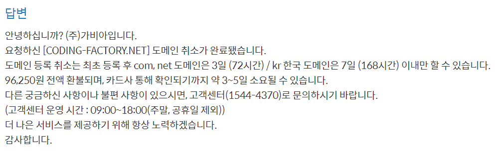 결론적으로 그냥 이 블로그는 티스토리 주소를 그대로 사용하기로 하고 신규로 확장하는 사이트에 도메인을 적용하기로 하였습니다. 지금 당장 도메인을 사용할 것은 아니므로 제가 구매한 도메인은 환불조치하였습니다. 다행히도 제가 구매한. net 도메인은 결제 후 72시간 내에는 전액 환불이 가능하다고 합니다. 아직 72시간이 경과하지 않아 가비아에 환불 요청 후 전액 환불받았습니다. 고객센터에 전화 한 통 하니 가비아 측에서 바로 환불해주었습니다. 다행이네요.