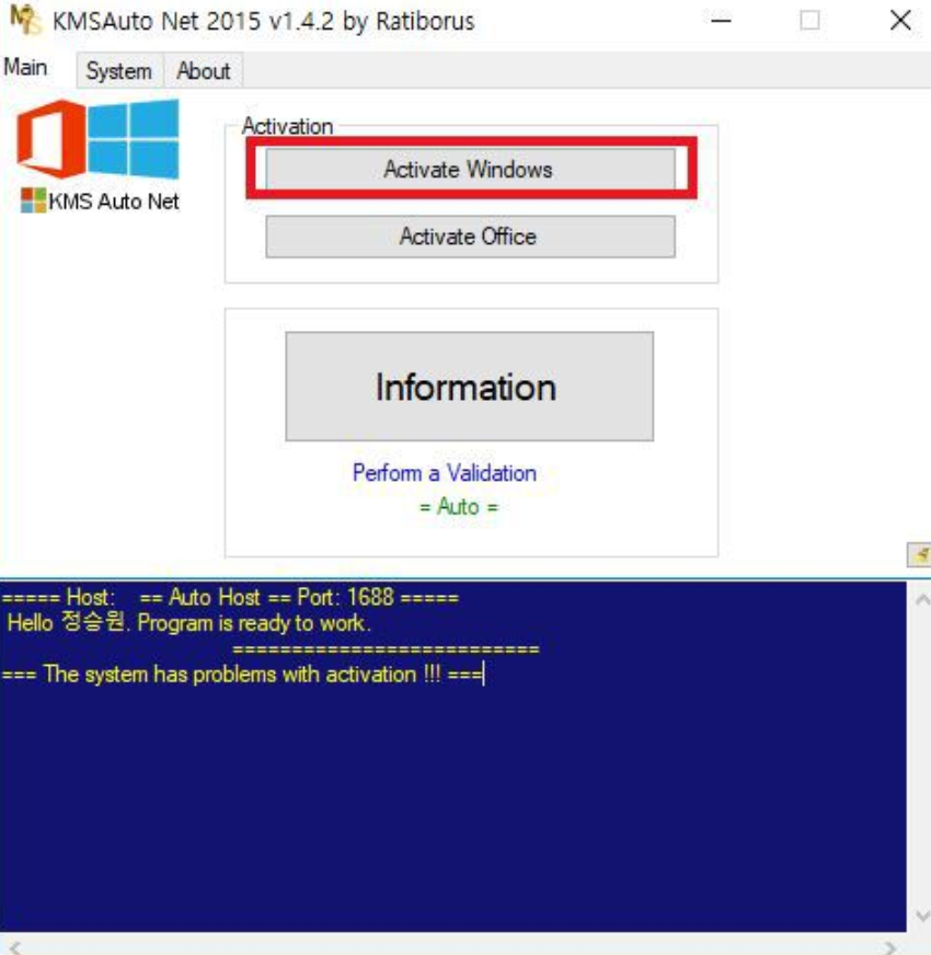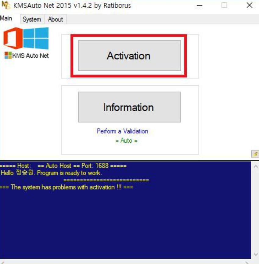 3. 윈도우 정품 인증 해야하니 KMSAuto Net을 관리자모드로 실행시킨 뒤 Actovation 버튼을 누릅니다.