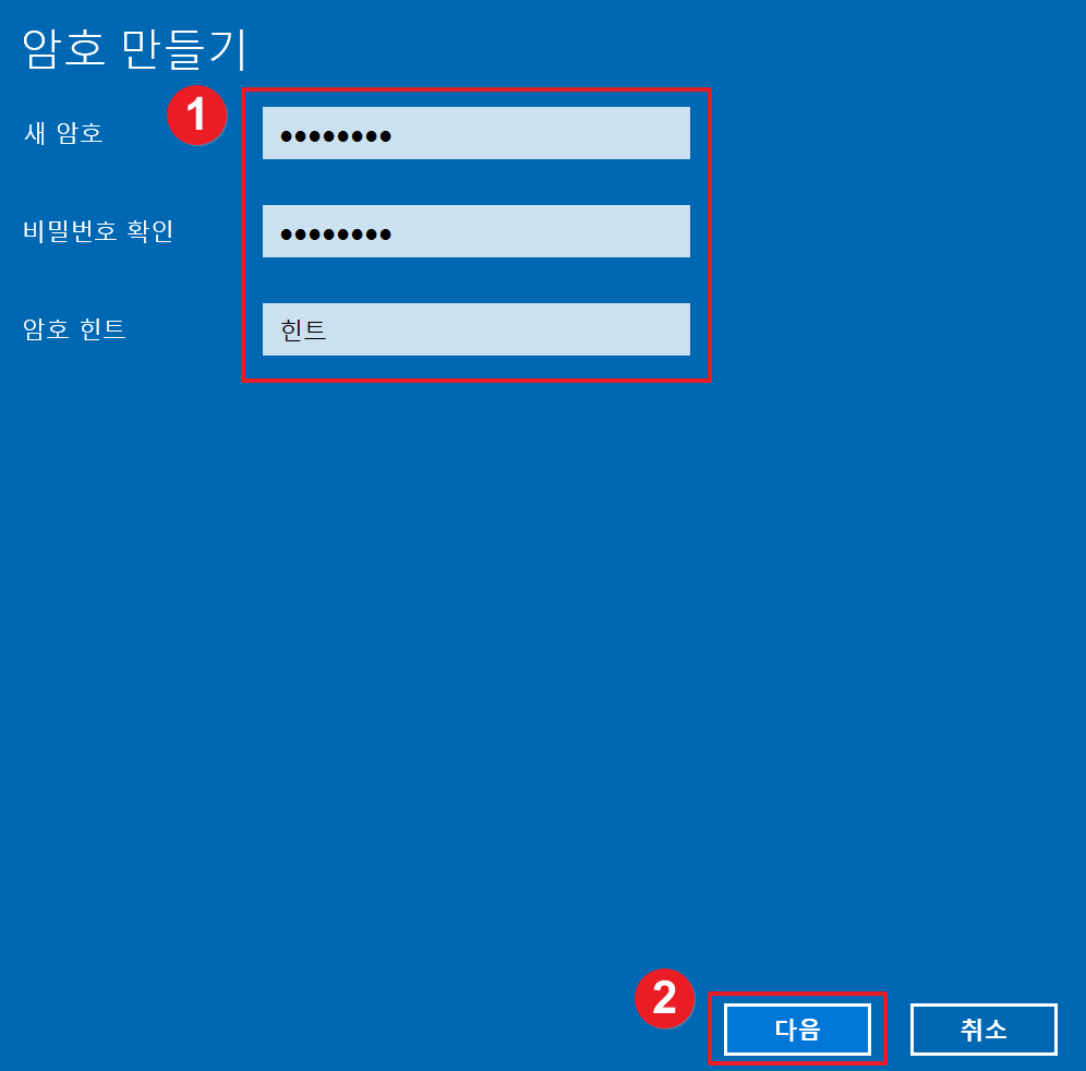 3. 자신이 설정하고싶은 비밀번호와 암호 힌트를 입력한 뒤 다음을 클릭합니다.
