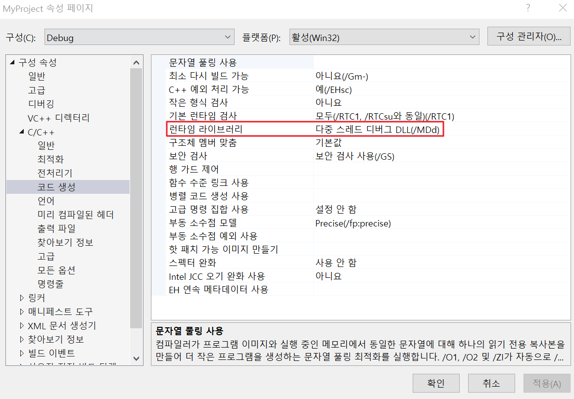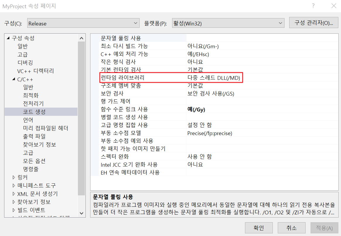 위에서 확인하셨듯 Release모드와 Debug의 컴파일 목적이 다르기 때문에 위와 같이 사용하는 런타임 라이브러리가 서로 다릅니다.