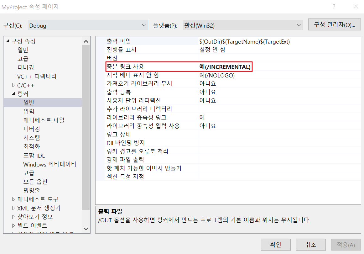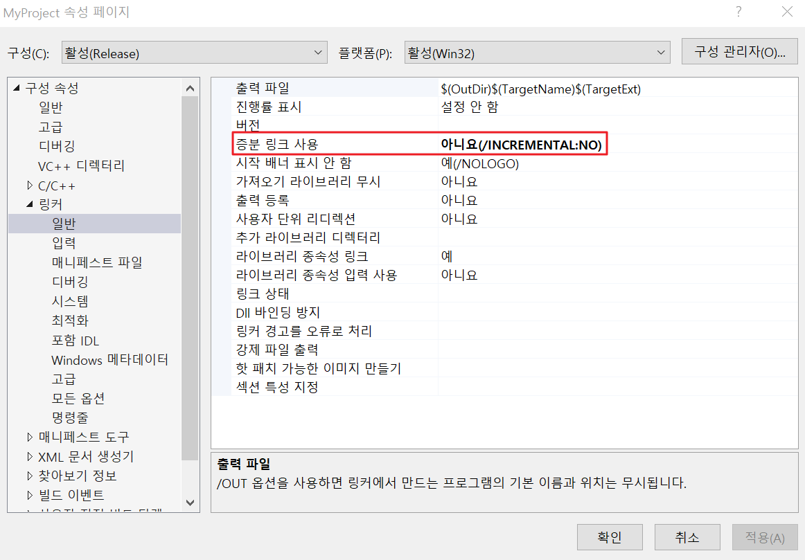 증분 링크 사용 여부가 다르다.