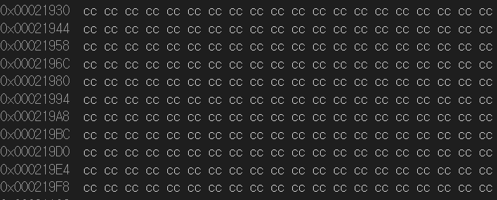 왼쪽은 Release 모드에서의 메모리 값이고 오른쪽은 Debug 모드에서의 메모리값입니다. 변수로 메모리 공간을 할당하고 그 값을 초기화시켜주기 전까지는 쓰레기 값이 들어가 있습니다. 이러한 쓰레기값이 문제를 일으킬만한 소지도 있겠죠. 그래서 Debug에서는 이 문제를 방지하기 위해 cc로 메모리 값을 밀어버립니다. Release모드의 경우 좌측 그림과 같이 쓰레기 값이 들어가 있는 반면 Debug에서는 우측 그림과 같이 쓰레기 값들을 전부 cc라는 값으로 초기화를 시켜준것을 보실 수 있습니다.