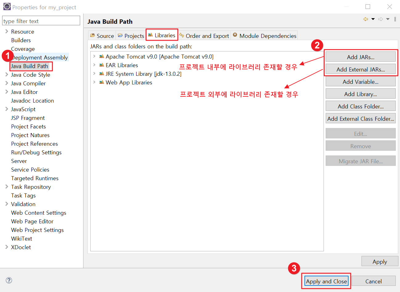 2. 좌측 트리에서 Java Build Path를 클릭하고 Libraries탭에서 추가해주시면 됩니다. 프로젝트 내부(lib폴더)에 라이브러리가 존재할 경우에는 Add Jars 버튼을 클릭하시면 되고 프로젝트 외부에 있다면 Add External JARs 버튼을 클릭해주세요.