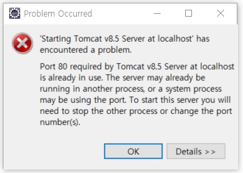 저는 톰캣에서 80 포트를 사용하고 있으므로 80 포트를 사용하고 있는 프로세스를 죽이는 방법으로 예를 들겠습니다.