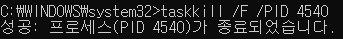 4. taskkill /F /PID [PID번호] 명령어를 입력하여 80포트를 점유하고 있는 프로세스를 kill 합니다.