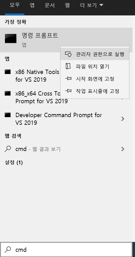 1. 작업표시줄 검색창에서 cmd를 입력하고 명령 프롬프트를 관리자 권한으로 실행시킵니다.