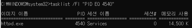 3. tasklist /FI "PID EQ [PID번호]" 명령어를 입력하고 해당 포트를 점유하고 있는 프로세스가 어떤 것인지 확인합니다. 저는 httpd.exe에서 점유하고 있었네요.