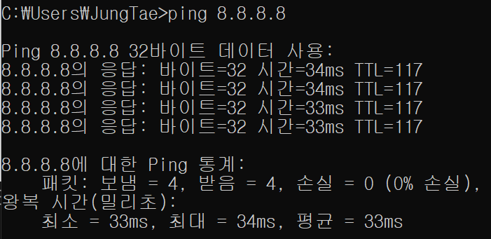 구글로 ping을 날려보았습니다. 위와 같이 정상적으로 ping을 주고받는다면 인터넷이 제대로 동작하고 있다면 위와 같이 패킷의 보낸 횟수와 받은 횟수가 같을것입니다.