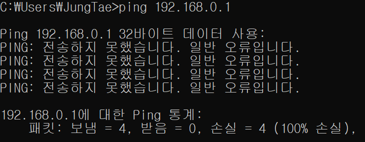 만약 공유기와의 연결이 제대로 되지 않는 다면 위와 같이 ping 전송에 실패하게 됩니다. 이때는 공유기의 동작이 정상적인지 PC와 공유기의 연결은 정상적인지를 확인해주시기 바랍니다.
