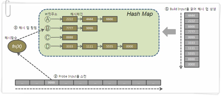 1. 둘 중 작은 집합(Build Input)을 읽어 Hash Area에 해시 테이블을 생성한다. (해시 함수에서 리턴 받은 버킷 주소로 찾아가 해시 체인에 엔트리를 연결)