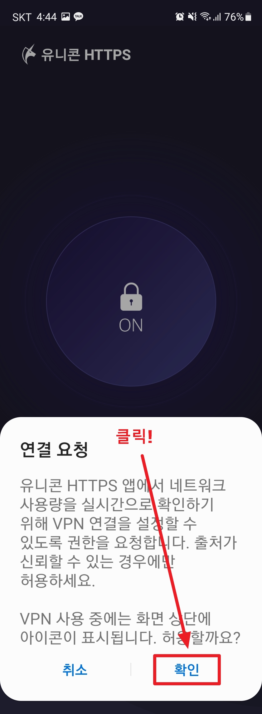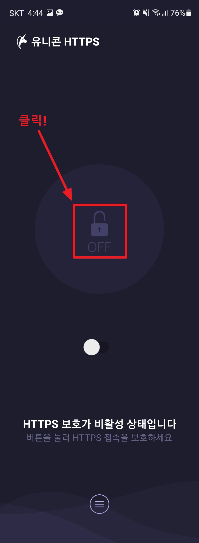 2. 설치한 유니콘 HTTPS 애플리케이션을 선택하고 가운데 OFF 자물쇠 버튼을 클릭해준 뒤 나타나는 연결 요청 팝업창에서 확인을 눌러주시면 차단당한 사이트도 접속이 가능해집니다.