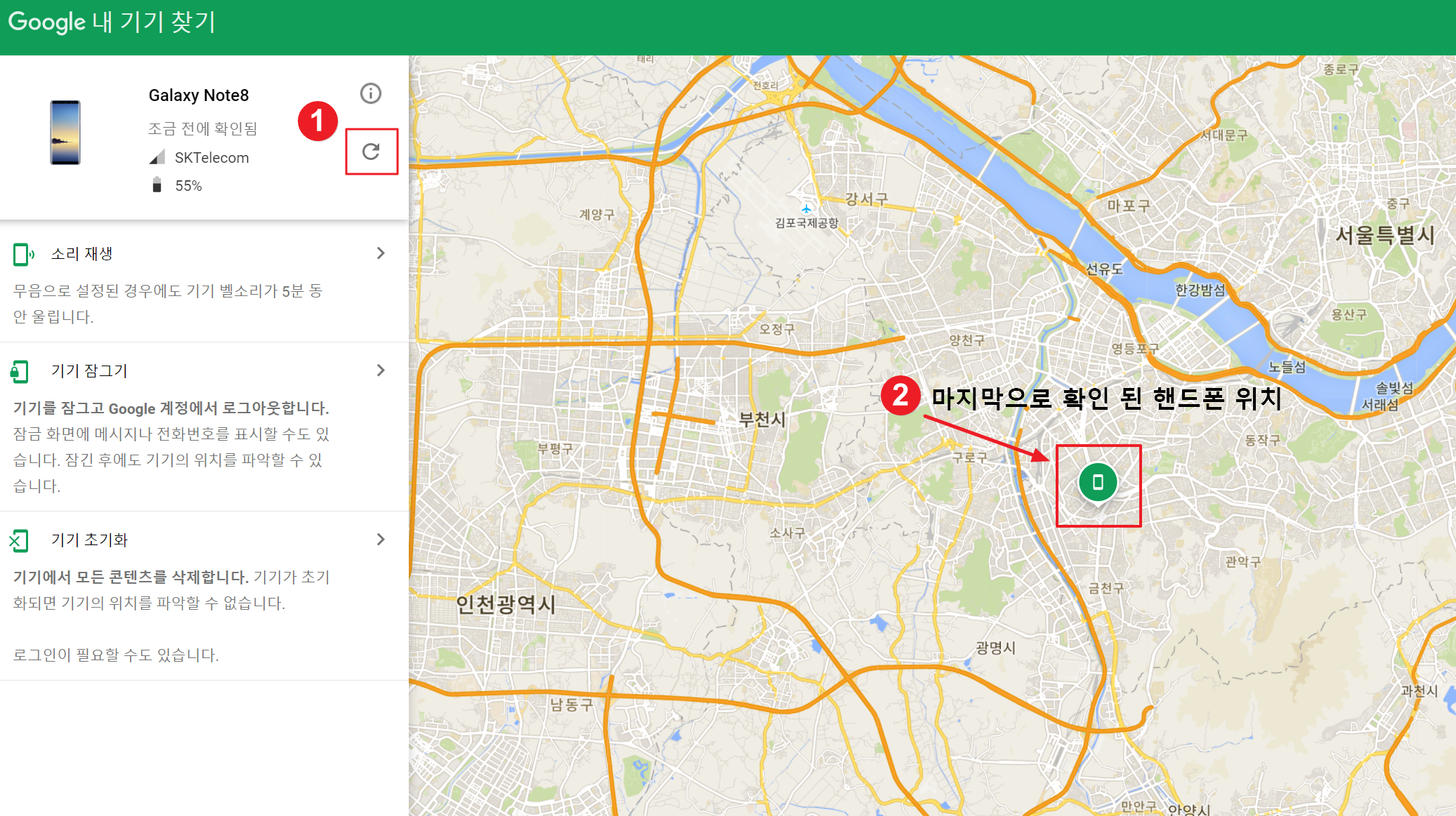 5. 좌측에 새로고침 버튼을 클릭한뒤 지도상에 마지막으로 확인된 내 핸드폰의 위치를 파악합니다. 핸드폰의 위치 기능이 켜져 있어야 정확한 현재 위치가 표시되며 핸드폰 배터리가 0퍼센트로 현재 핸드폰이 꺼져있다면 휴대폰이 꺼진 시간과 꺼지기 마지막으로 확인된 핸드폰의 위치가 표시됩니다.