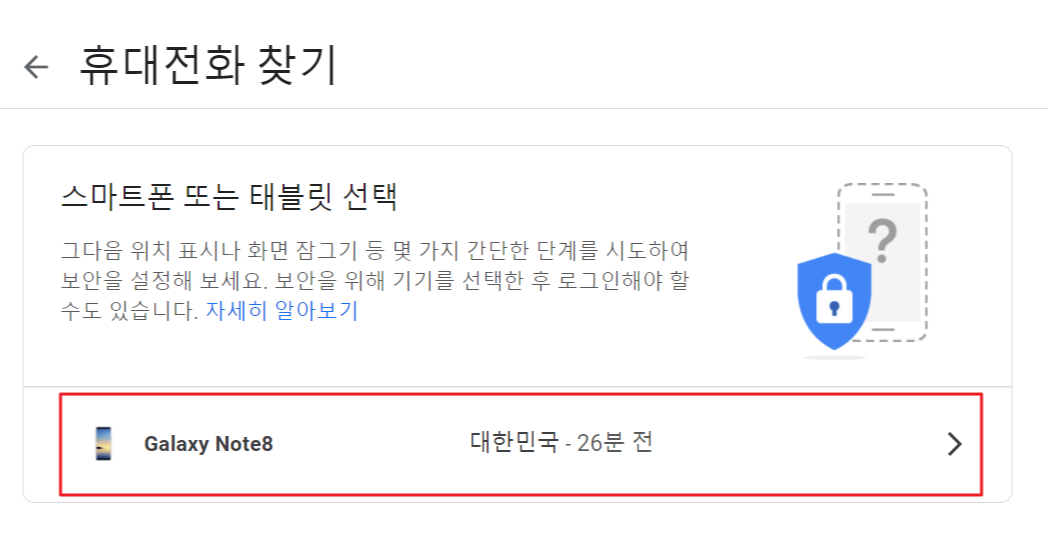 3. 휴대전화 찾기 메뉴에 들어가 보면 위와 같이 구글 계정으로 로그인되어있는 핸드폰, 태블릿 등의 리스트들이 나옵니다. 이 리스트에서 내가 찾고자 하는 휴대폰을 선택하여 들어갑니다. 만약 이 리스트에 내 핸드폰이 노출되지 않는다면 다른 방법을 알아보셔야 합니다. 아래 링크를 참고하시어 다른 방법을 강구해보세요.