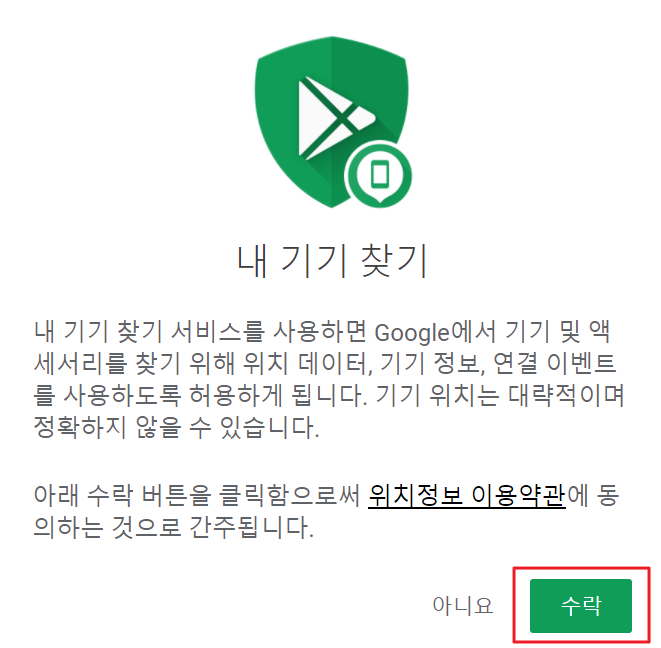 4. 내 기기 찾기 서비스를 사용하기 위해서는 위치 정보 이용약관에 동의해야 합니다. 팝업창의 수락 버튼을 클릭합니다.