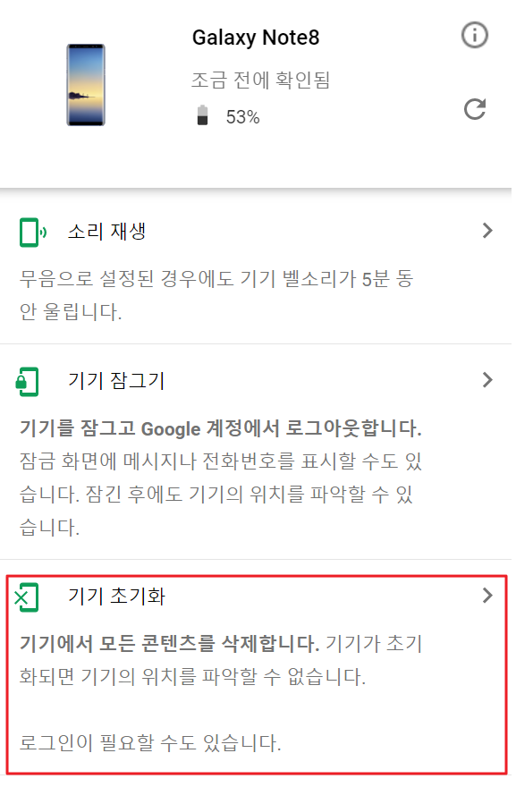 9. 끝까지 휴대폰을 찾지 못하였다면 필요시 기기 초기화를 통해 핸드폰에 남아있는 내 개인정보를 삭제할 수 있습니다. 휴대폰에 남아있는 모든 데이터를 완전히 삭제합니다. (SD 카드는 삭제되지 않을 수 있음) 이렇게 초기화를 진행하면 이후 내 기기 찾기를 통해 휴대폰을 찾는 것이 불가능해지니 주의바랍니다.
