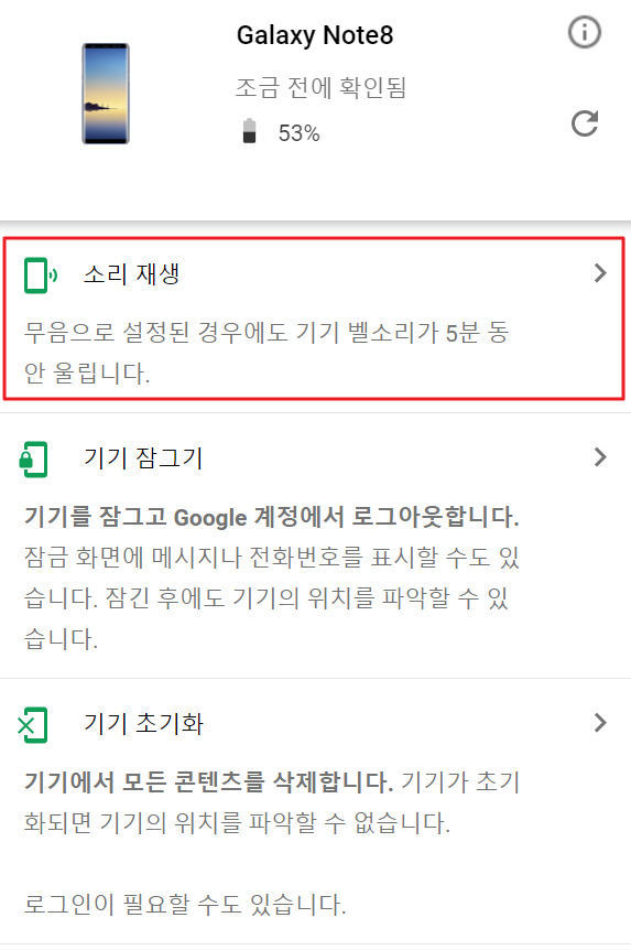 6. 내 휴대폰의 위치는 정확한 좌표가 찍히는 것이 아니라 주변 범위 1km 정도의 범위 정도로만 표기되기 때문에 핸드폰을 쉽게 찾기 힘들 수도 있습니다. 휴대폰을 찾기가 힘드시면 인근 위치에서 위의 사진처럼 소리 재생이라는 기능을 사용해서 내 핸드폰의 벨소리가 울리도록 해줍시다. 해당 기능은 핸드폰이 무음 상태여도 알림음을 최대로 하여 5분 동안 벨소리가 울리게 해 줍니다.