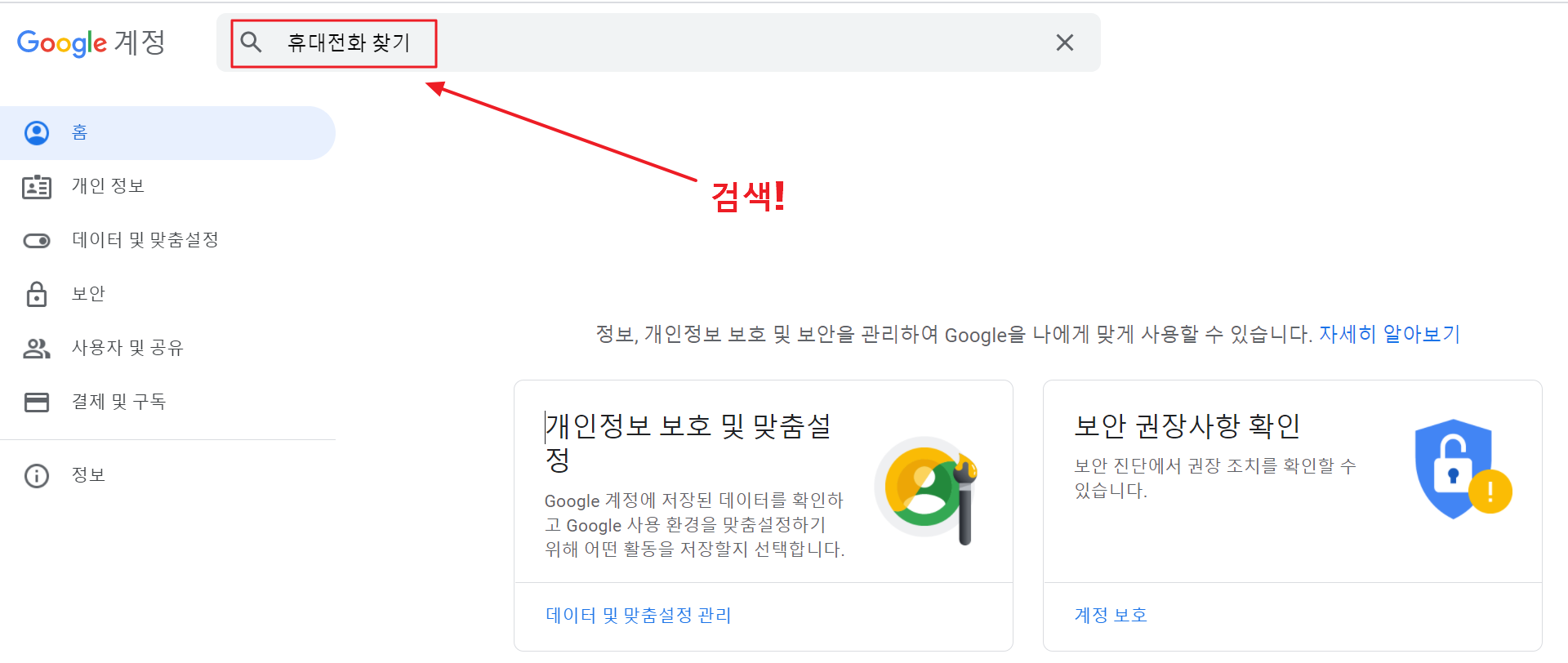 2. 검색창에 휴대전화 찾기라고 검색한 후 Enter를 눌러 해당 메뉴로 들어가 줍니다.