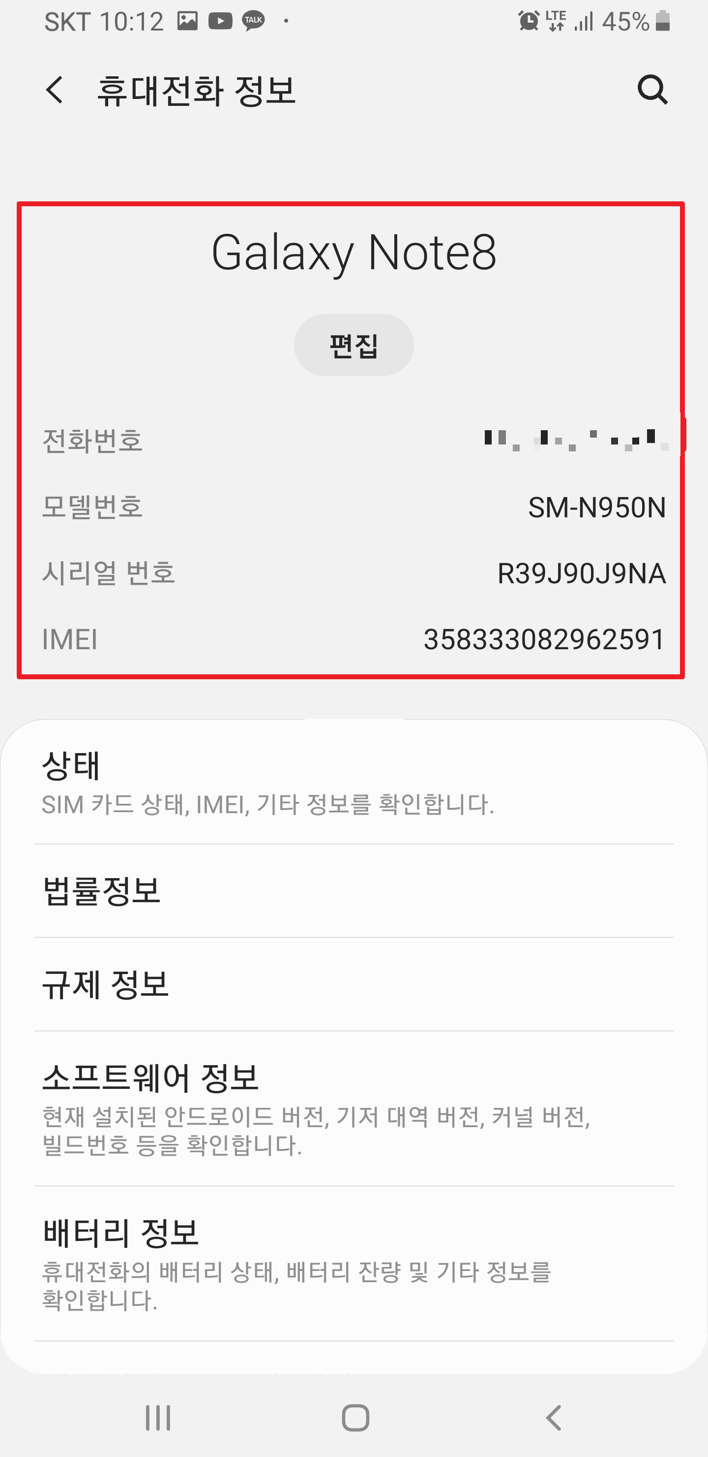 3. 휴대전화 정보의 상단 상태창에서 내 휴대폰의 기종을 확인하실 수 있습니다. 이외에도 해당 메뉴에서 기종뿐만 아니라 현재 내 핸드폰에 설치되어있는 소프트웨어 정보나 배터리 정보 등도 확인하실 수 있습니다.