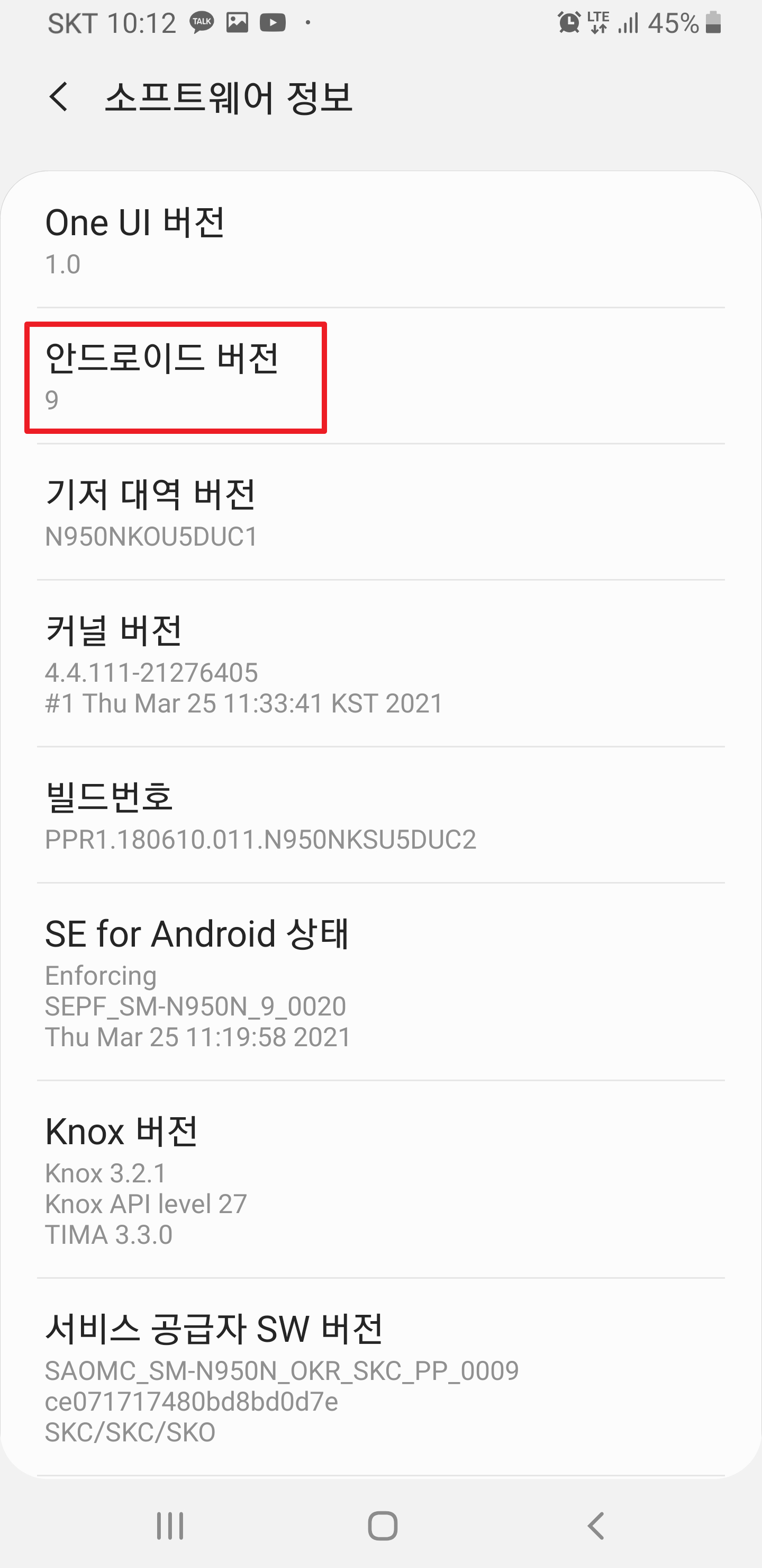 4. 여기서 안드로이드 버전을 확인하실 수 있습니다. 2021년 7월 기준으로 최신 버전은 9입니다. 이 탭에서 안드로이드의 버전뿐만 아니라 One UI버전, 커널버전, Knox버전등 내 핸드폰에 설치되어 있는 다양한 소프트웨어의 정보들을 확인하실 수 있습니다.