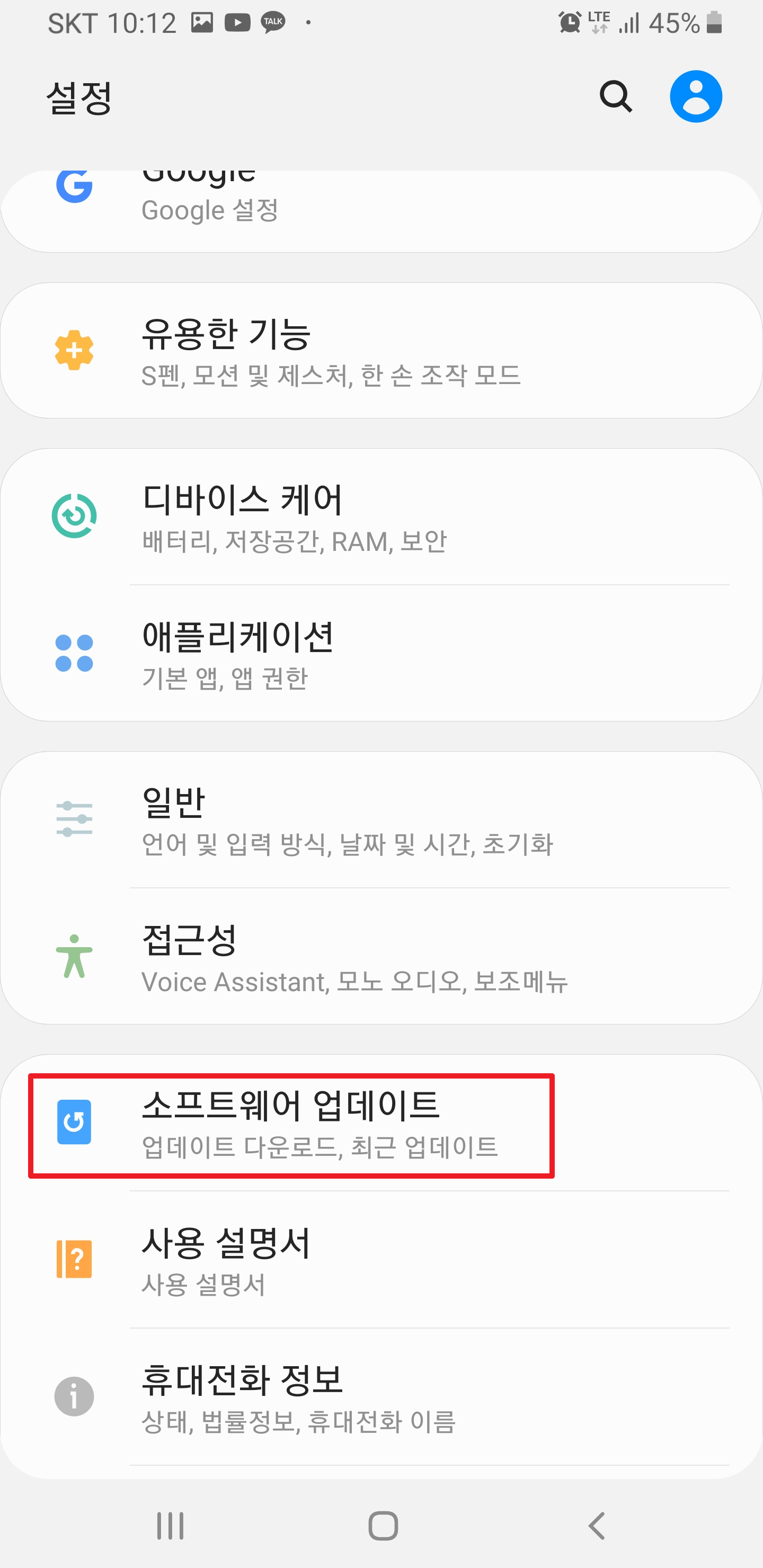 2. 설정앱에서 소프트웨어 업데이트로 들어가줍니다. 참고로 구형 기기에서는 최신 Android 버전으로 업데이트 하지 못할수도 있습니다.