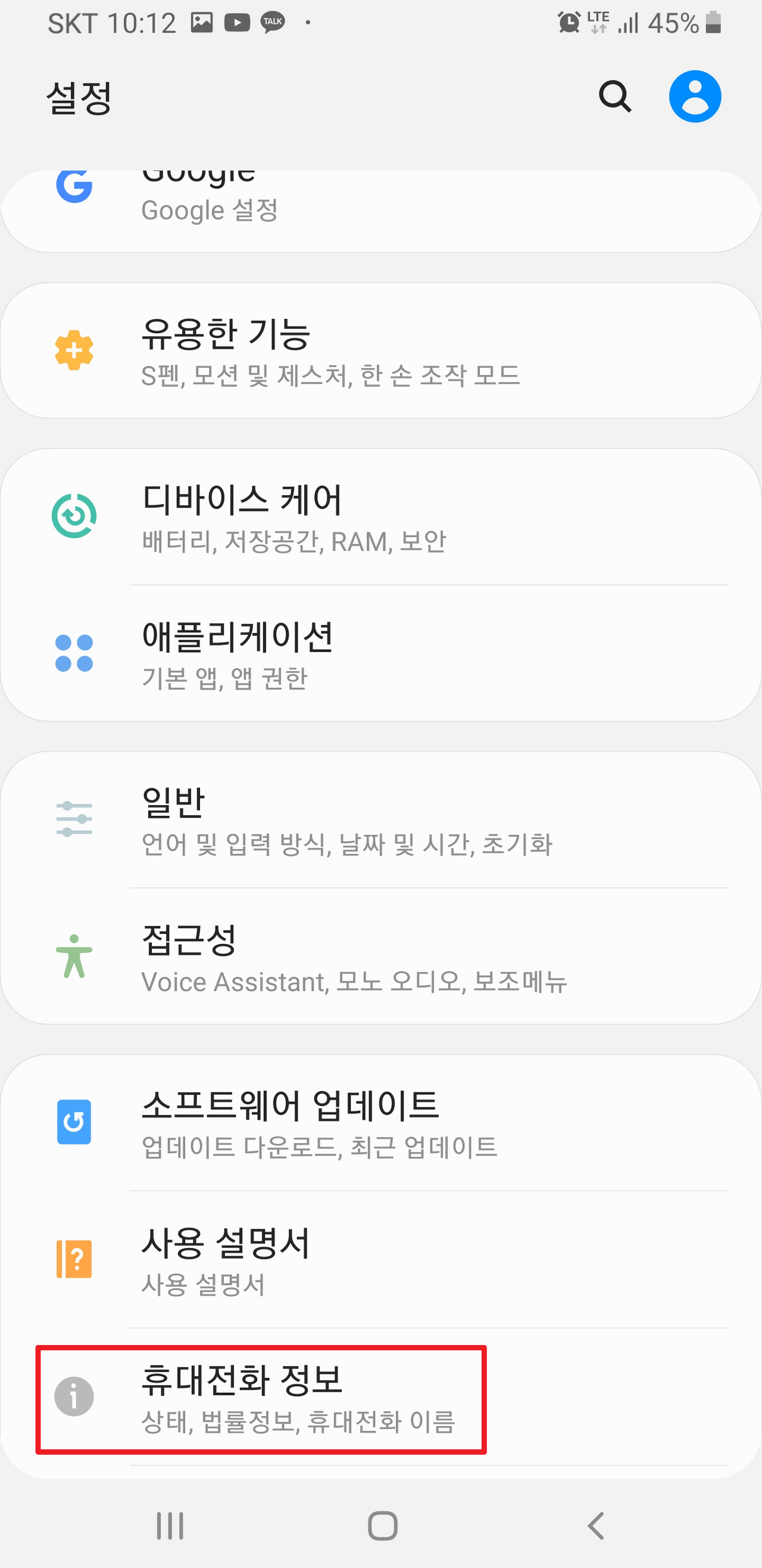 2. 설정에서 가장 아래에 있는 휴대전화 정보로 들어갑니다.