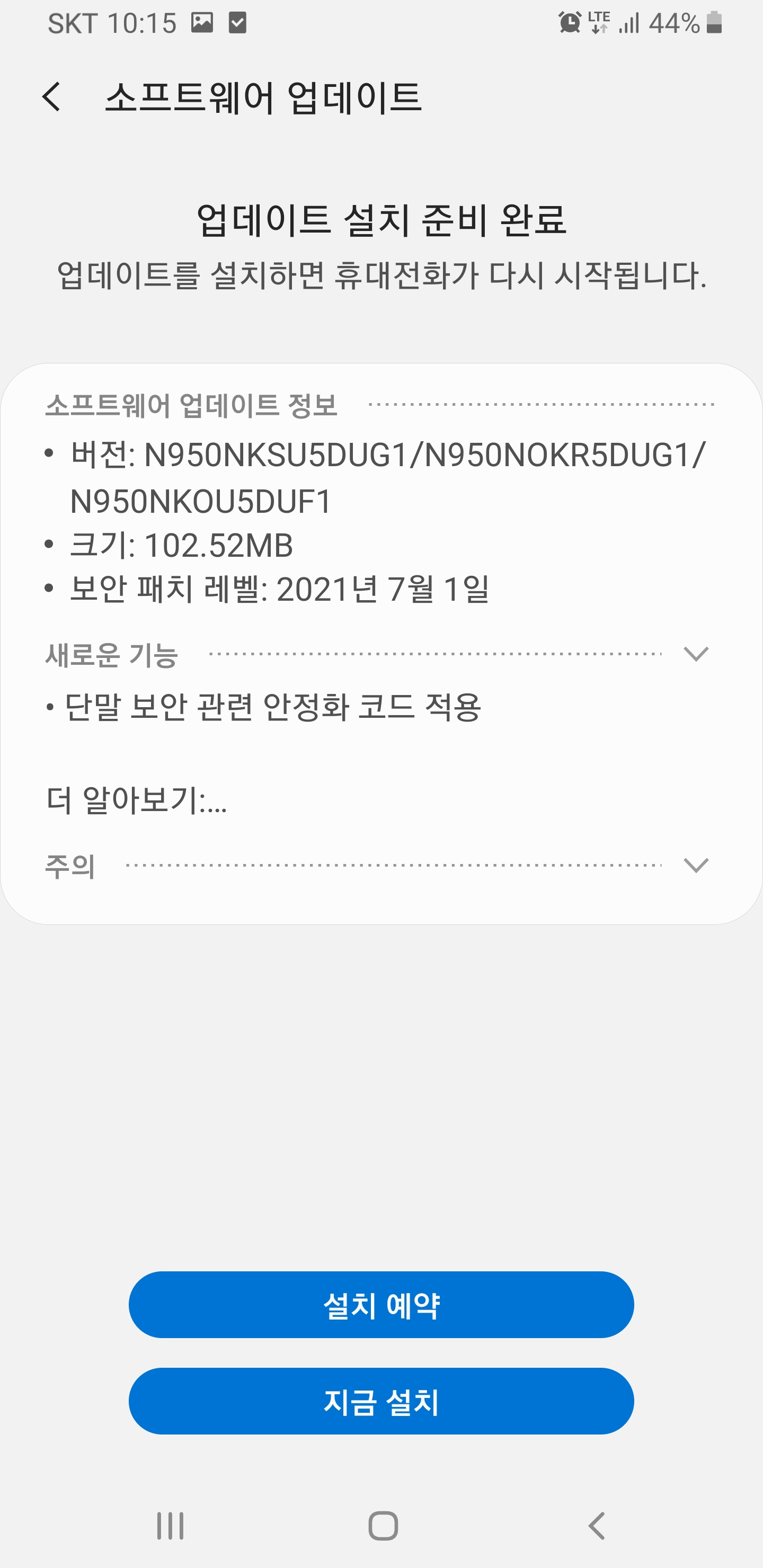 3. 이곳에서 안드로이드의 버전 업그레이드를 포함해 최신 소프트웨어로 업그레이드 할 수 있습니다. 업데이트 방법으로는 설치 예약, 지금 설치 이렇게 두가지 방법이 있는데요. 소프트웨어 업데이트를 하면 설치하는 시간도 걸릴뿐더러 핸드폰을 재부팅해야하기에 급한것이 아니라면 설치 예약으로 진행하시는것을 추천드립니다.