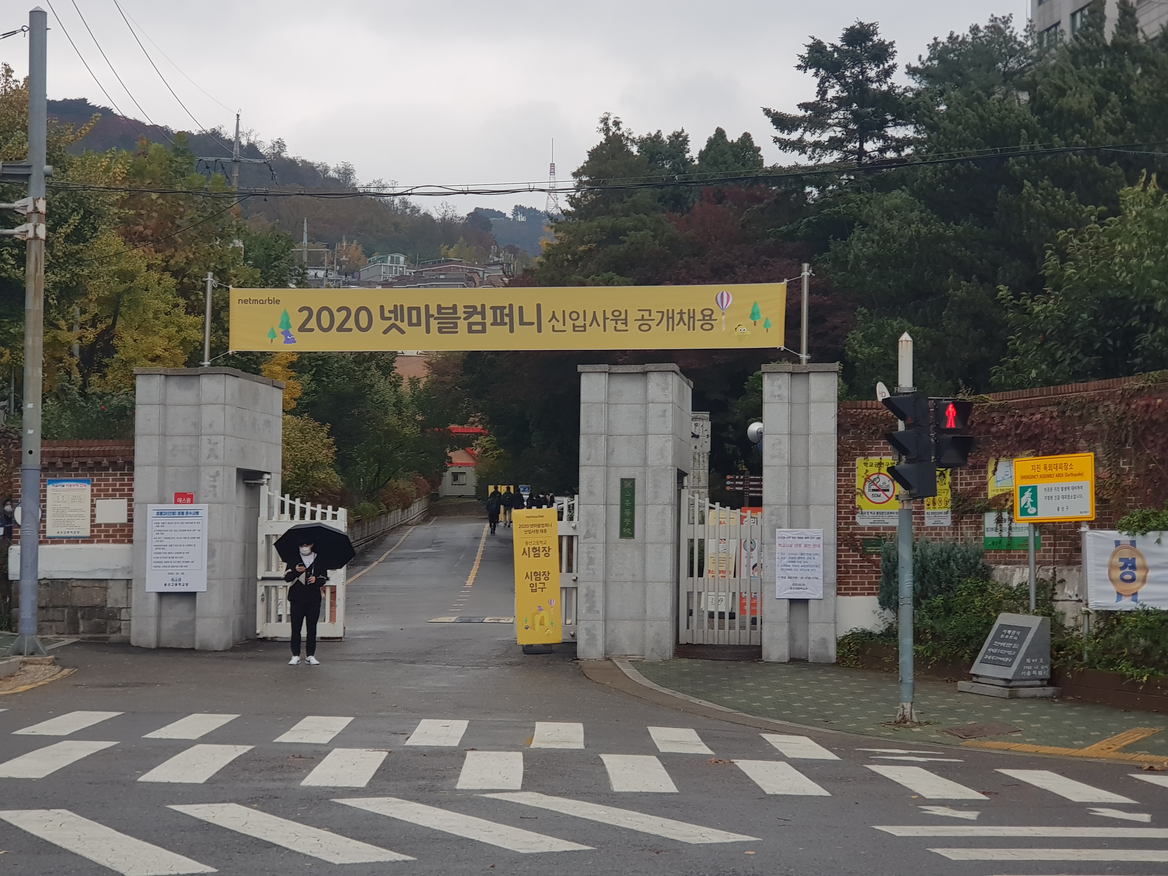 2020년도 넷마블 테스트는 용산에 있는 한 고등학교에서 이뤄졌습니다. 자세한 내용은 메일로 날라오니 참고하시면 됩니다. 학교 안에 들어가면 각 계열사와 직무별로 어디에서 시험을 쳐야 하는지 고시해주는 표가 있어요. 계열사들이 많았음에도 불구하고 응시자의 수는 NC소프트 때와 비교하면 비교적 적은 편이었습니다. 직무당 10명 ~ 20명 정도가 시험을 봤던 것 같아요. 필기시험은 넷마블 애사심 테스트와, CS문제들 이렇게 나뉘었습니다.