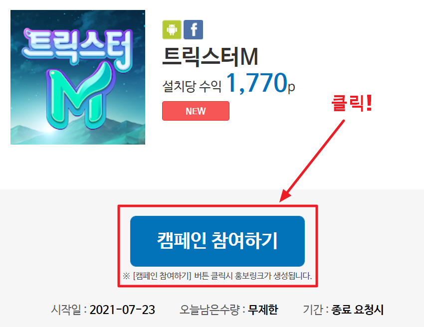 3. 자신이 하고 싶은 광고로 들어갔으면 그 광고의 캠페인 참여하기 버튼을 클릭하여 링크를 생성한 뒤 링크 복사하기 버튼을 눌러 자신의 블로그에 붙여 넣어 주시면 됩니다.