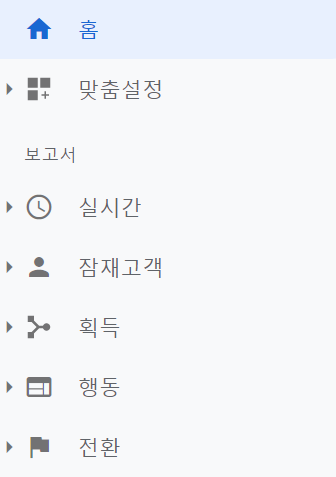 - 전환 : 웹사이트 내에서 구매 혹은 특정 이벤트(회원 가입, 다운로드 등) 달성과 같이 목표로 한 행위에 대한 전환 행위 데이터를 보여줍니다.