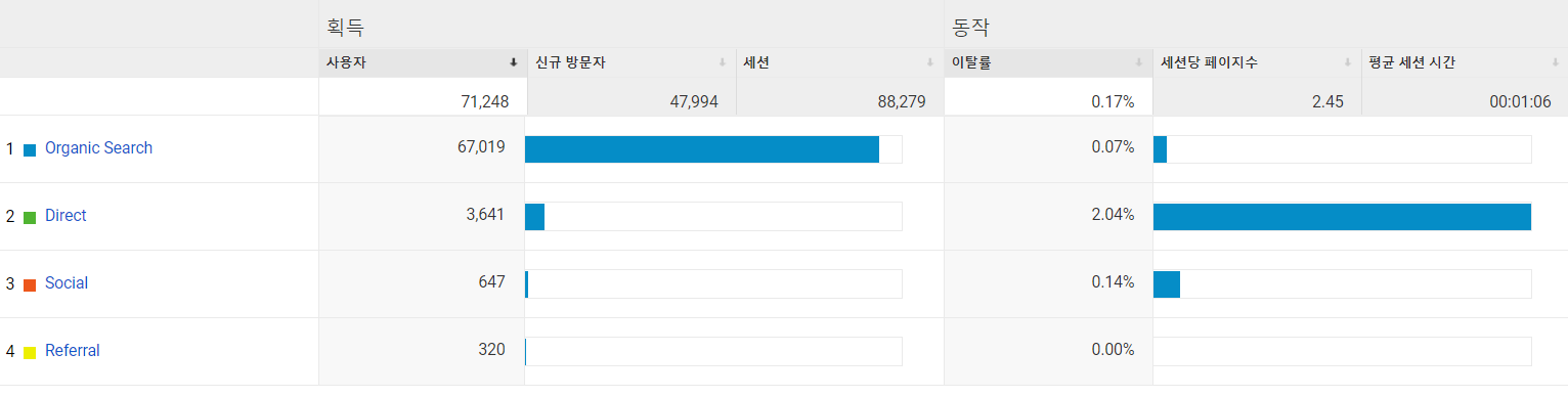 획득에서는 웹사이트 사용자들이 어떤 채널 혹은 유입 경로를 통해서 웹사이트에 접속했는지 보여줍니다. 개인적으로 저는 잘 사용하지는 않는 메뉴입니다.