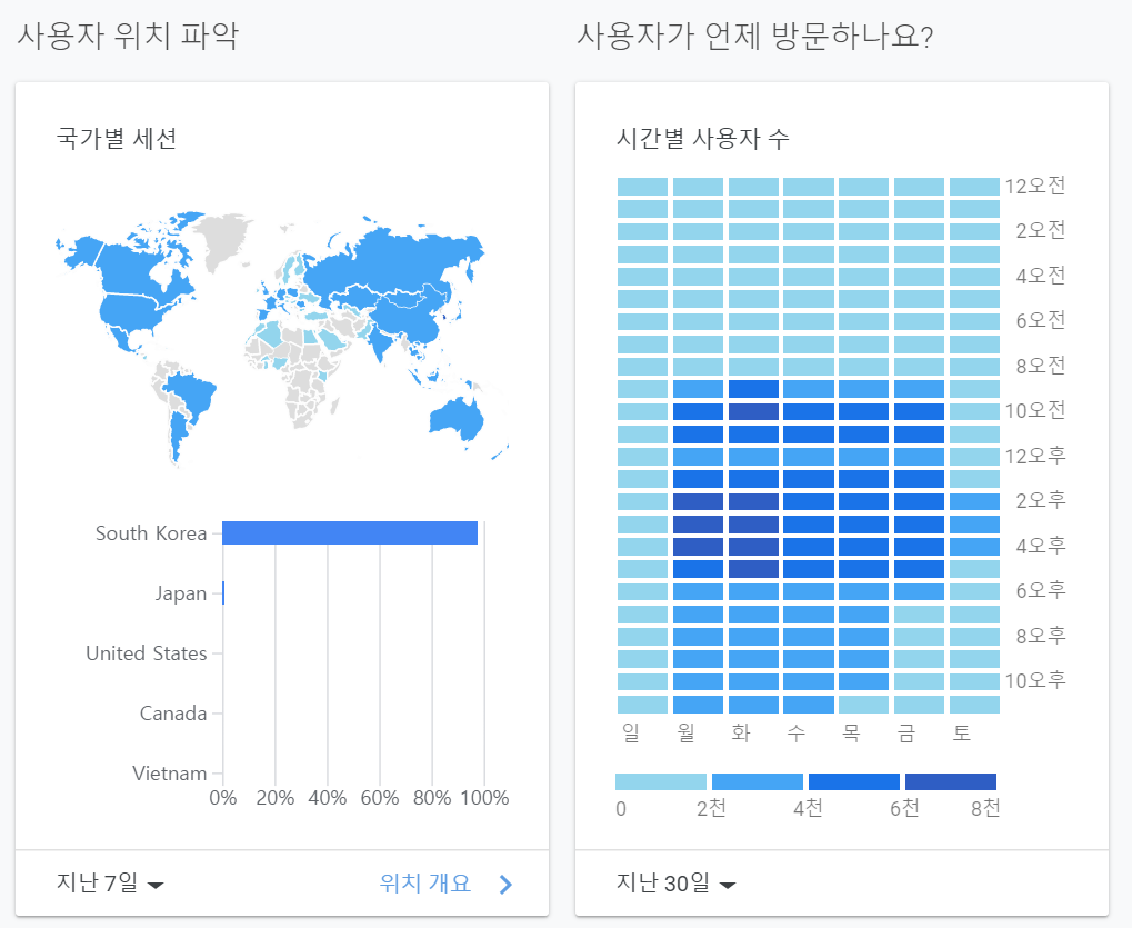 - 지역 통계 (Geo): 지역 통계 보고서는 사용자의 사용 언어와 지역 정보를 보여줍니다. 어떠한 언어와 지역을 타겟으로 파악하는 데에 도움이 됩니다.